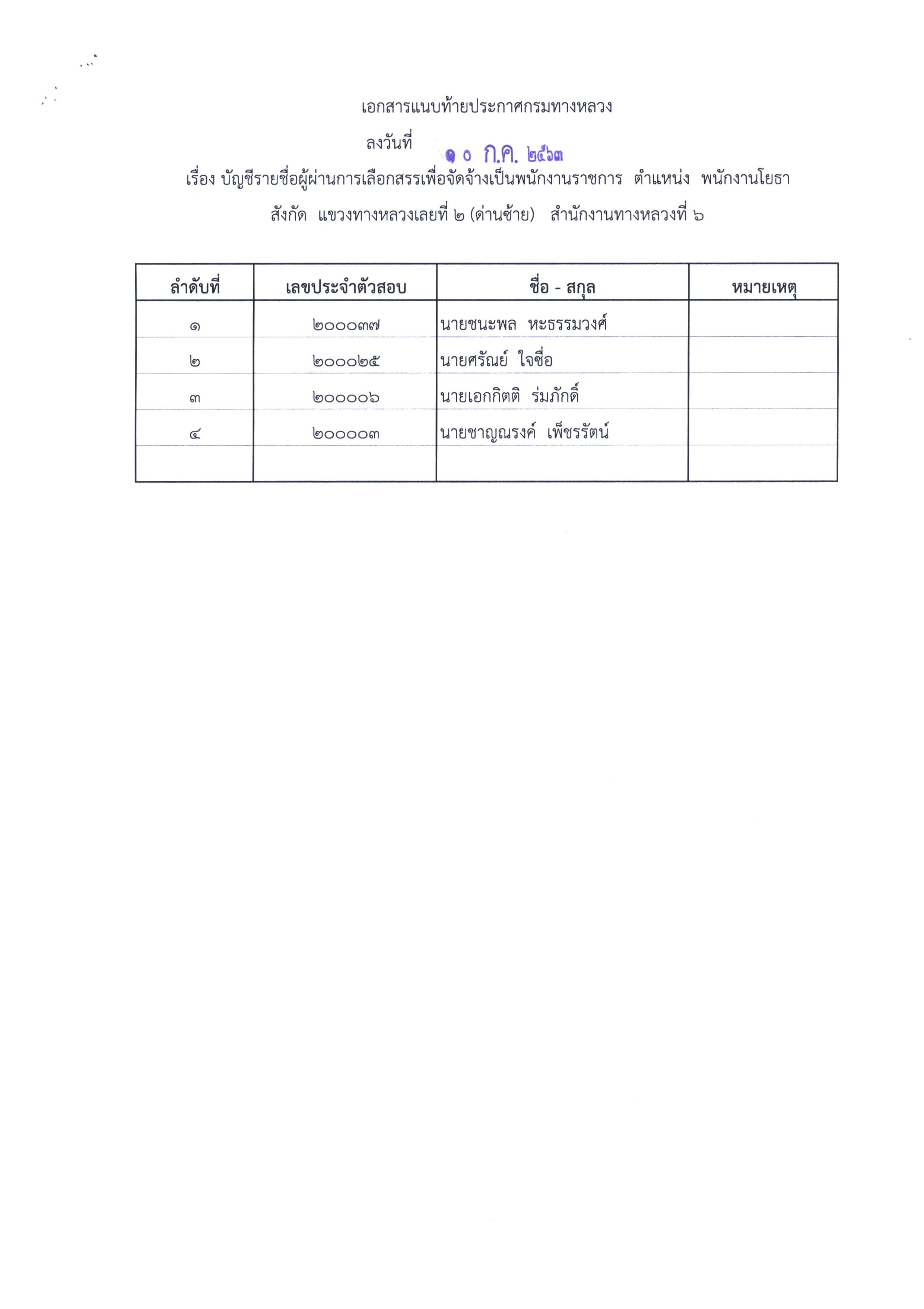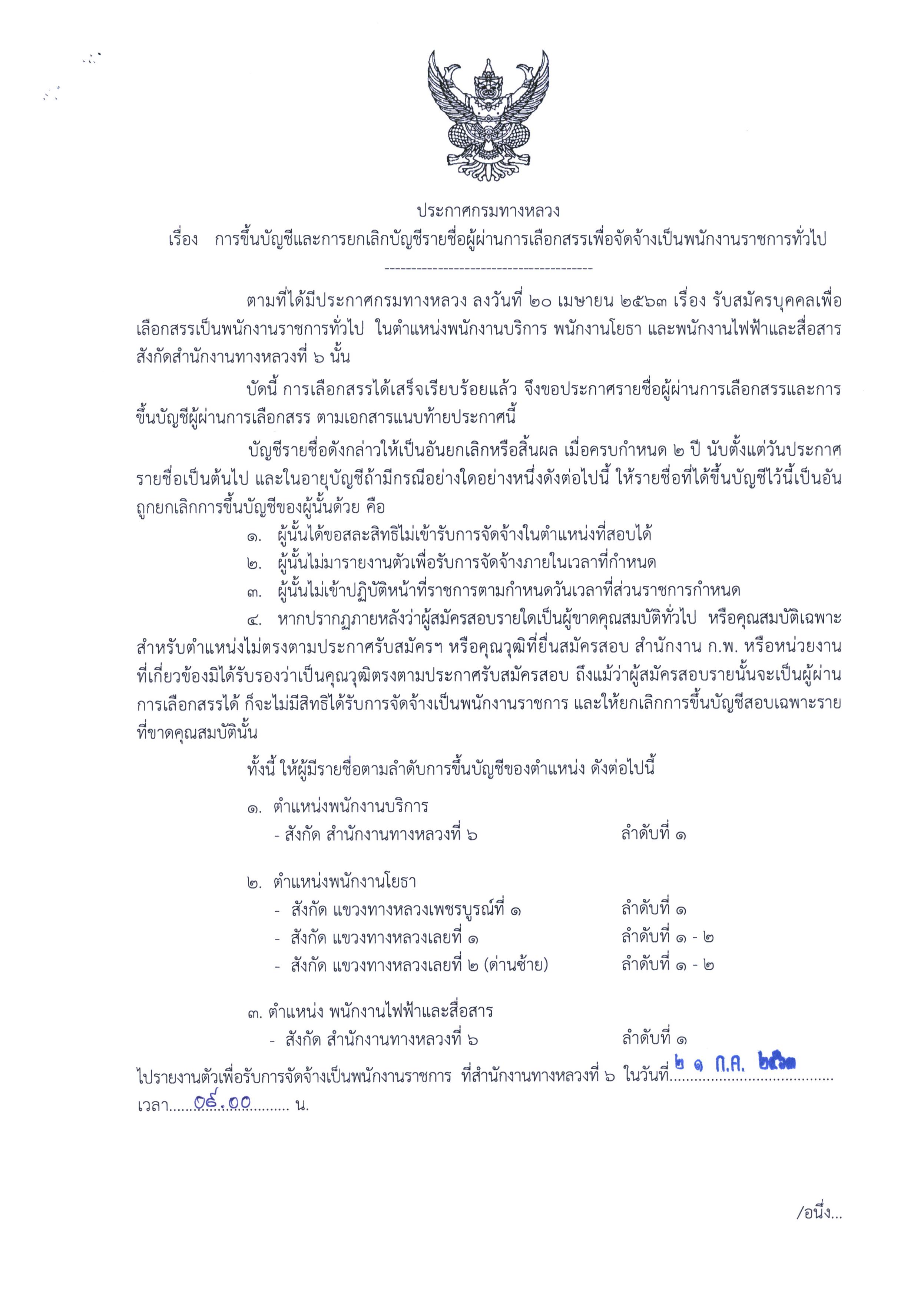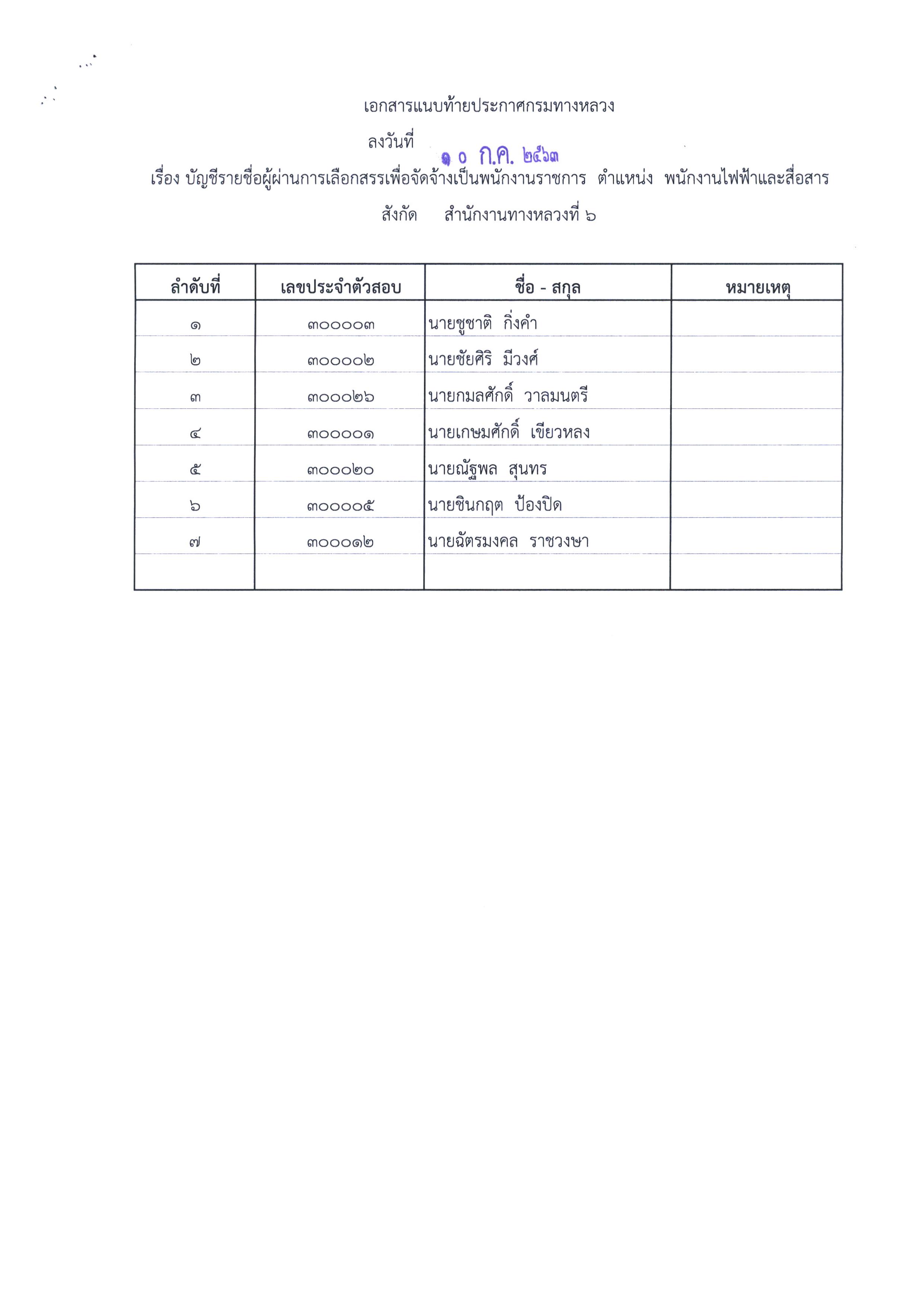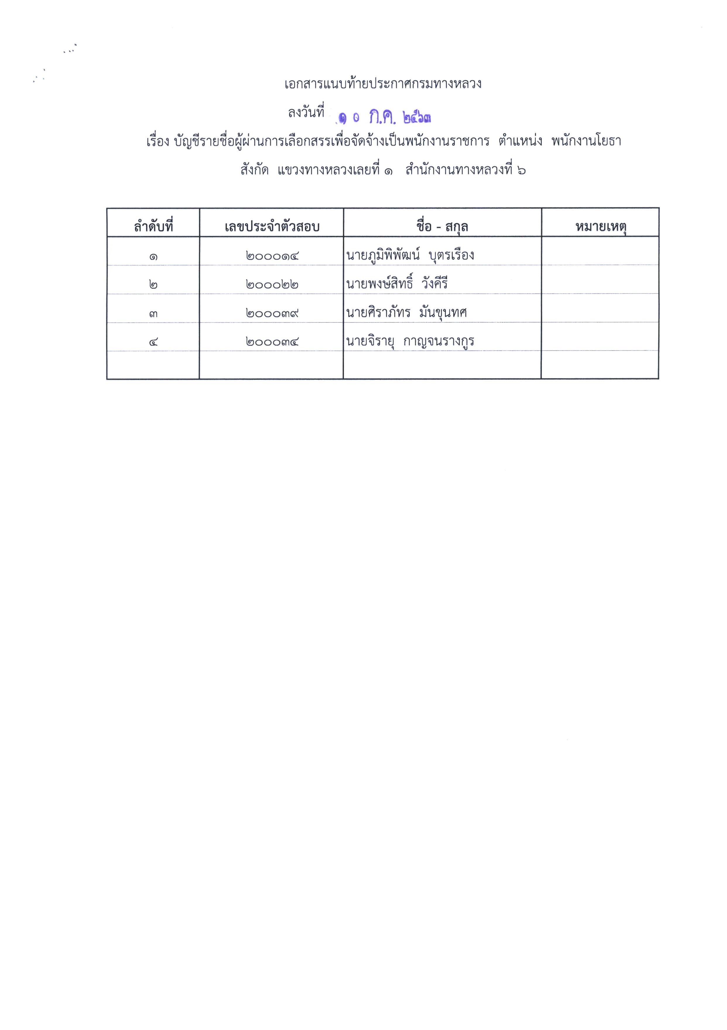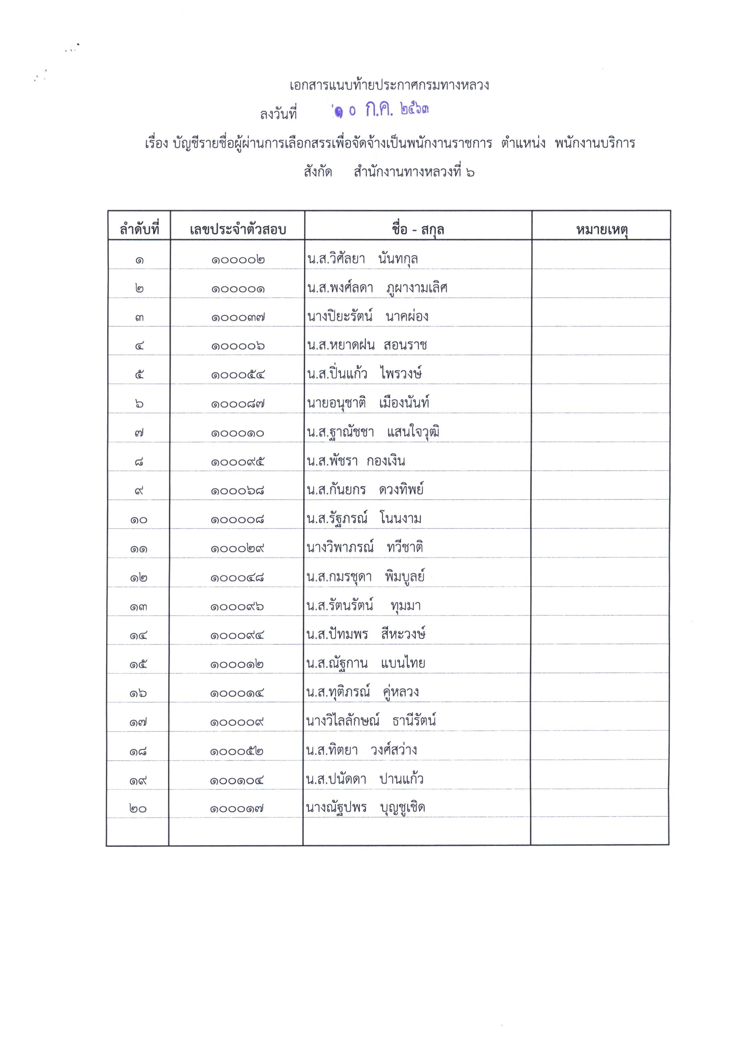 สำนักงานทางหลวงที่ 6 (เพชรบูรณ์) ประกาศผลสอบผู้ผ่านการเลือกสรรเพื่อจัดจ้างเป็นพนักงานราชการทั่วไป ตำแหน่งพนักงานบริการ, ตำแหน่งพนักงานโยธา, ตำแหน่งพนักงานไฟฟ้าและสื่อสาร