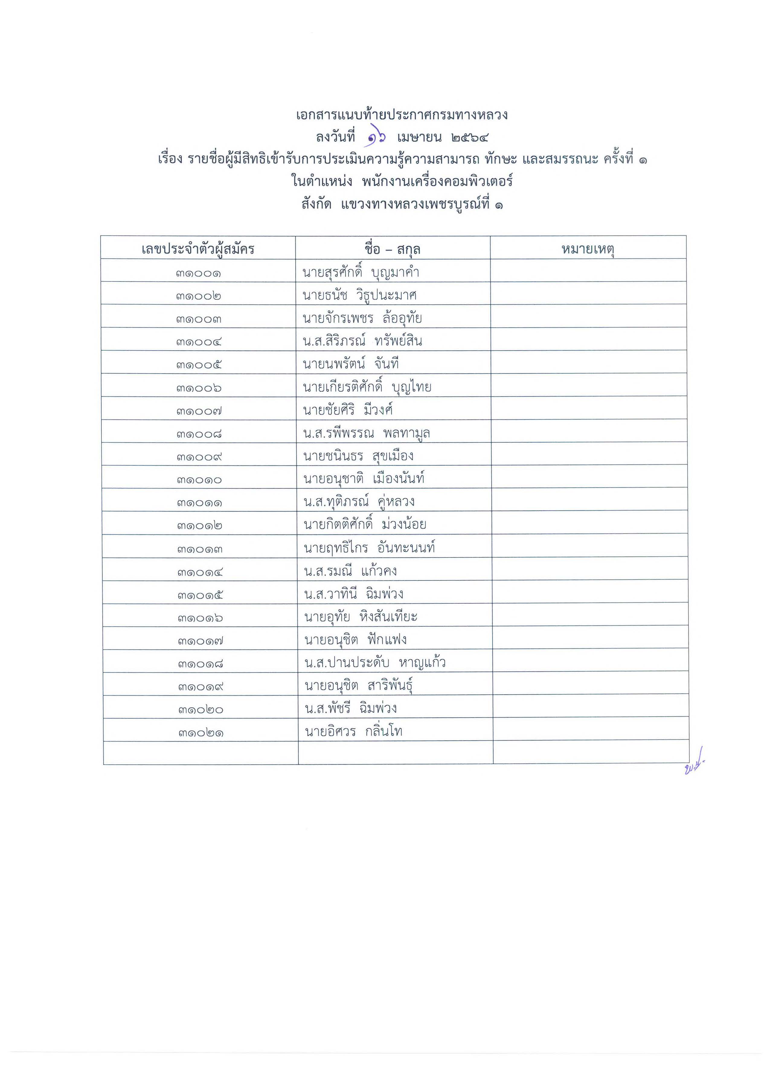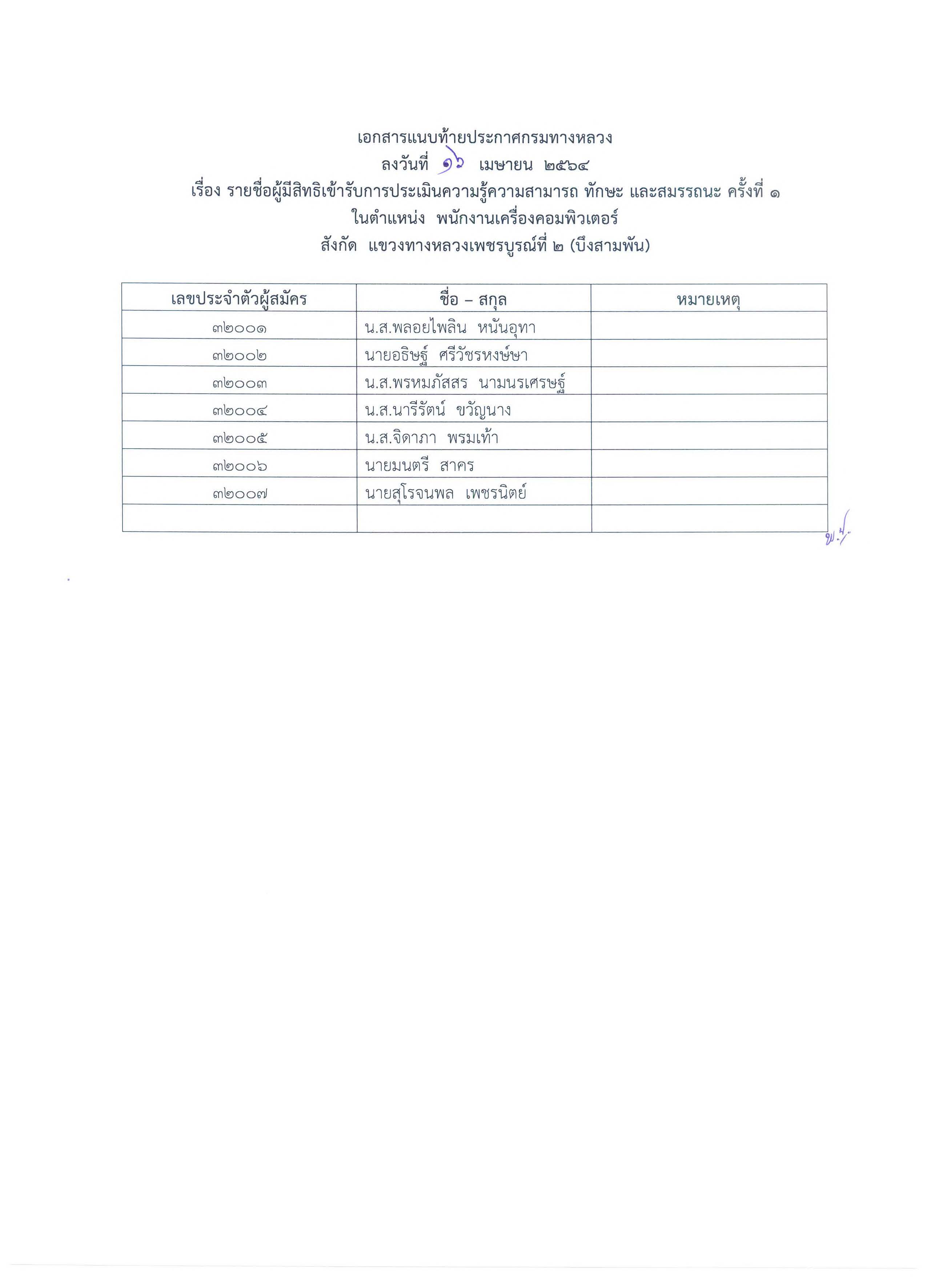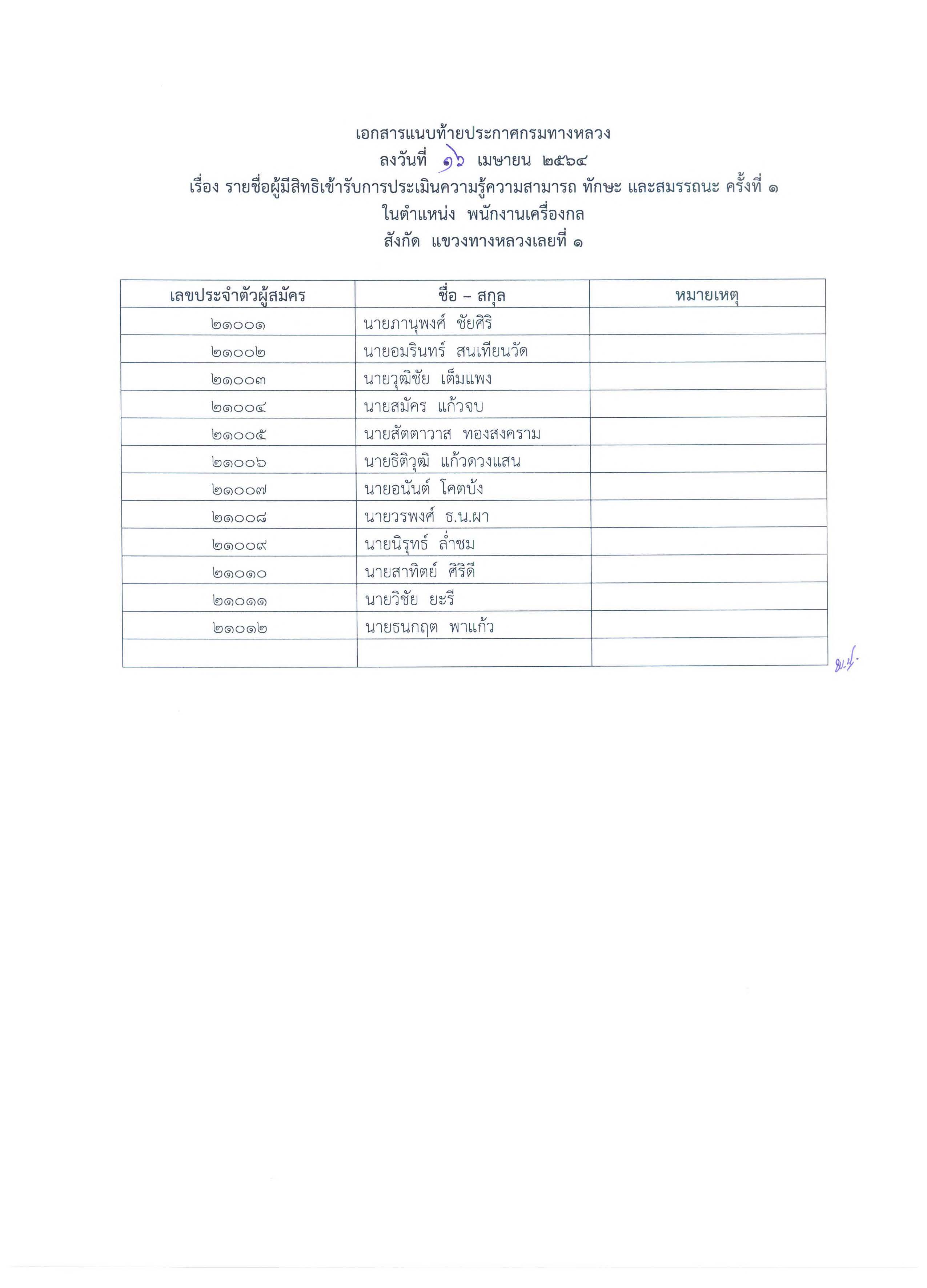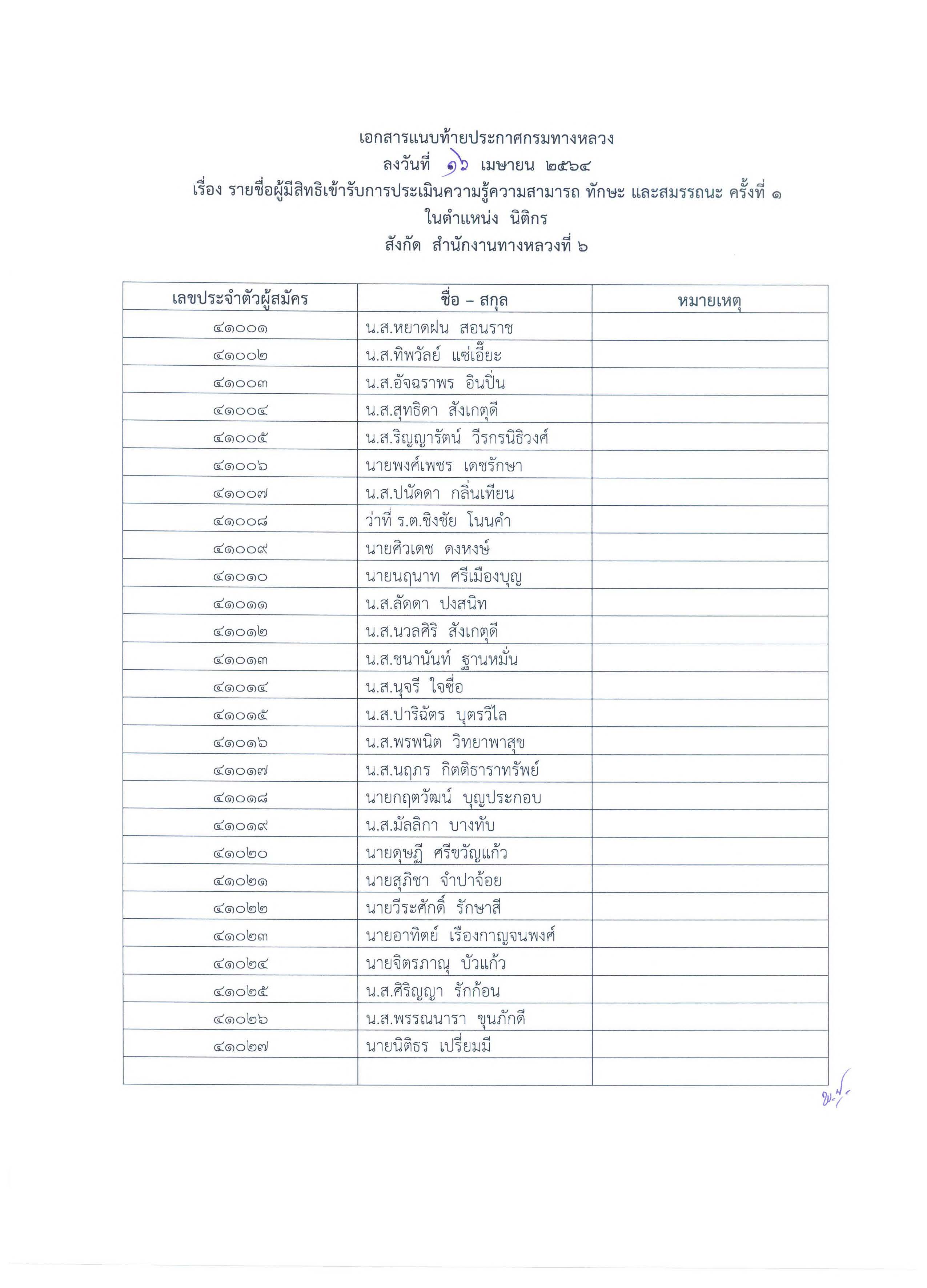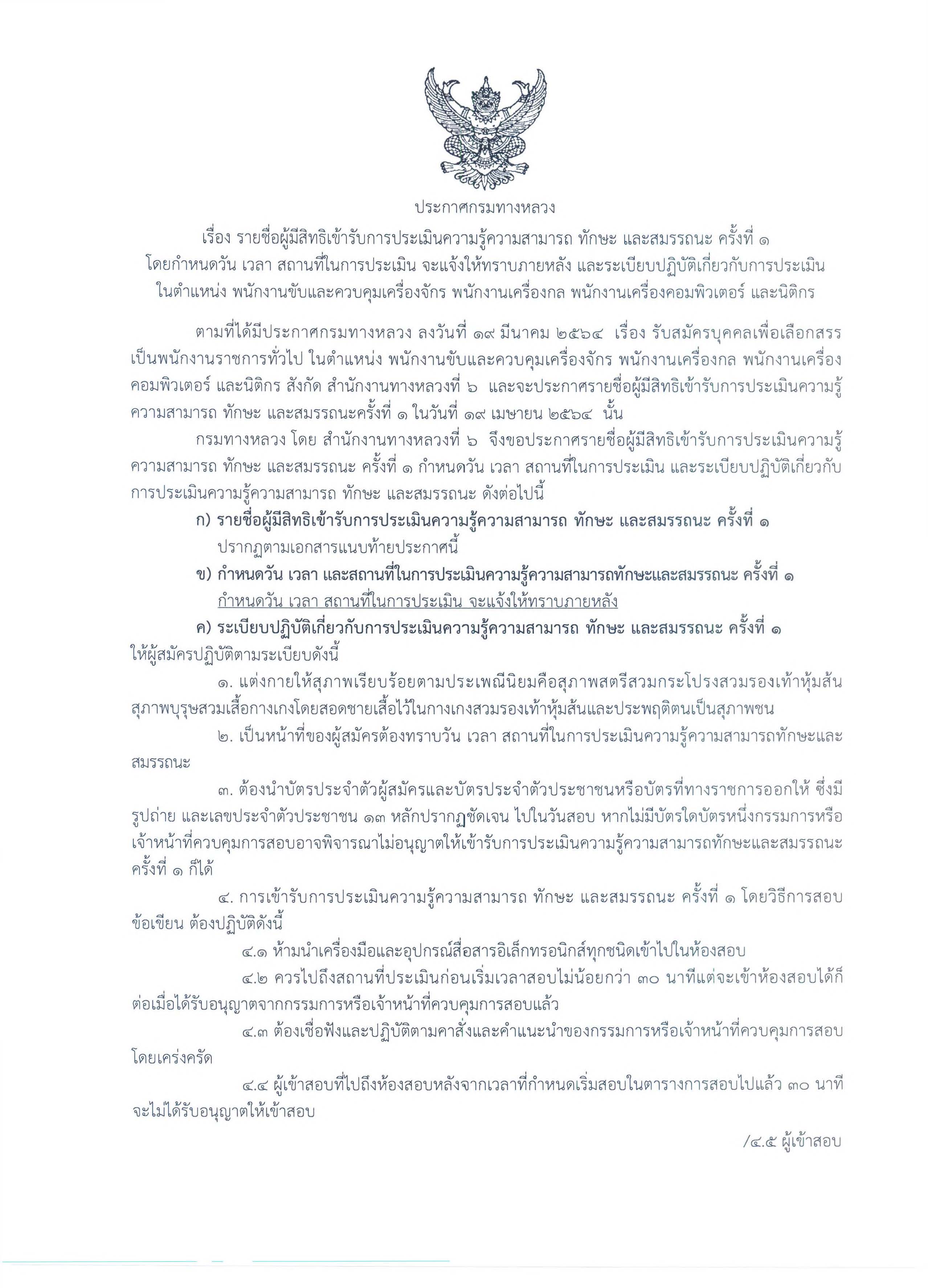 สำนักงานทางหลวงที่ 6 (เพชรบูรณ์) ประกาศรายชื่อผู้มีสิทธิเข้ารับการประเมินสมรรถนะครั้งที่ 1