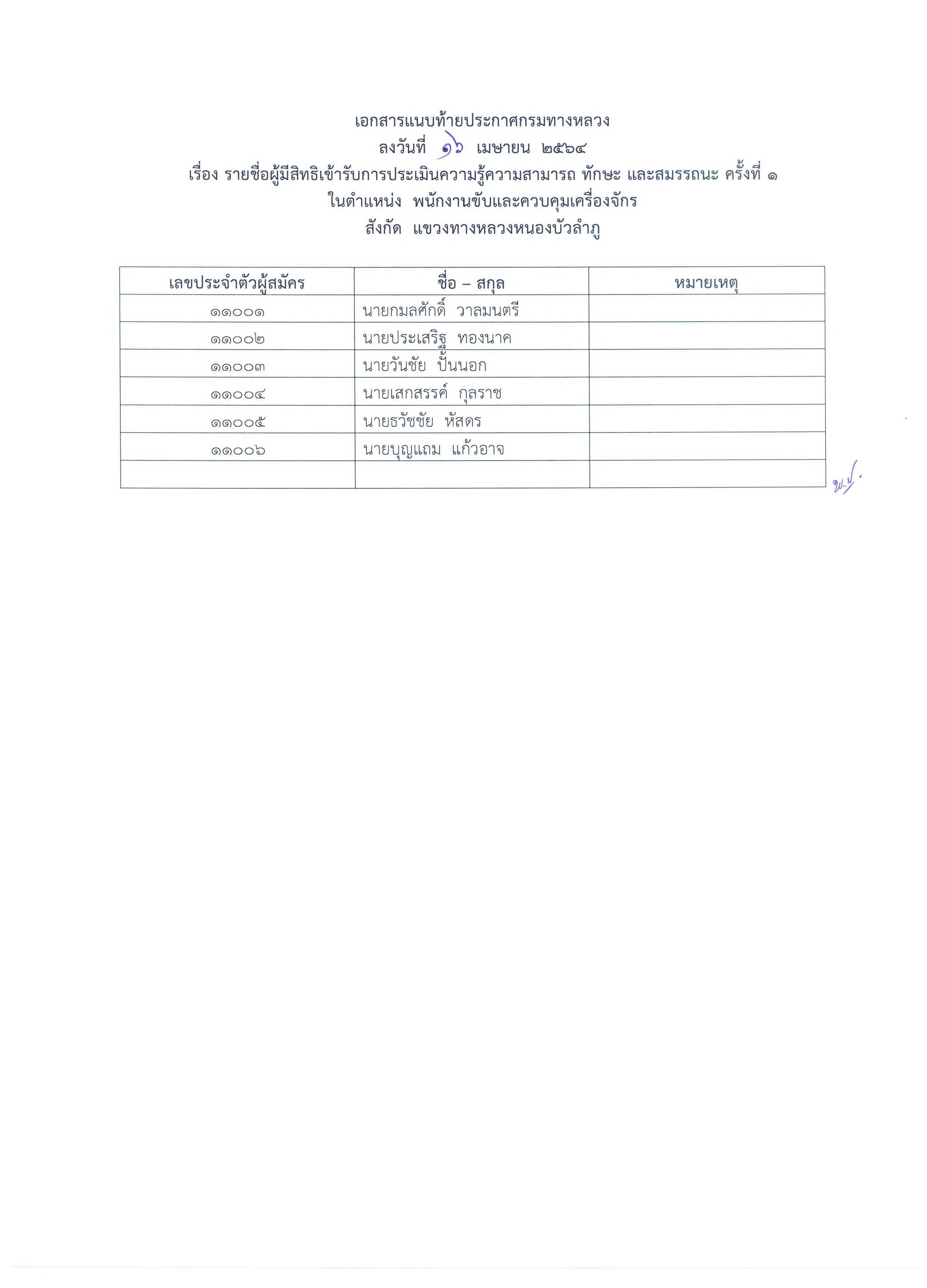 ประกาศรายชื่อผู้มีสิทธิเข้ารับการประเมินสมรรถนะครั้งที่ 1 ตำแหน่งพนักงานขับและควบคุมเครื่องจักร, ตำแหน่งเครื่องกล, ตำแหน่งพนักงานคอมพิวเตอร์ และตำแหน่งนิติกร