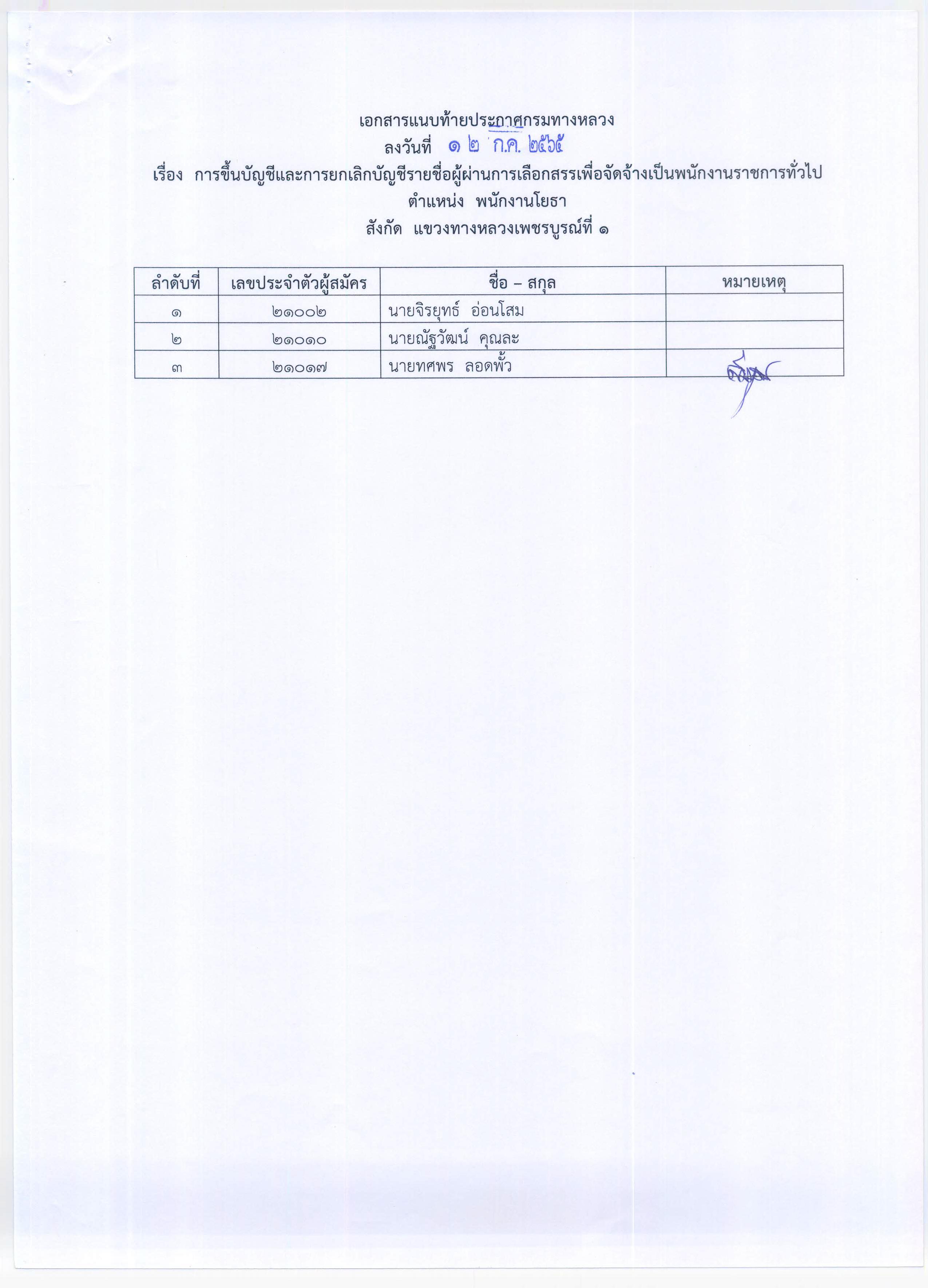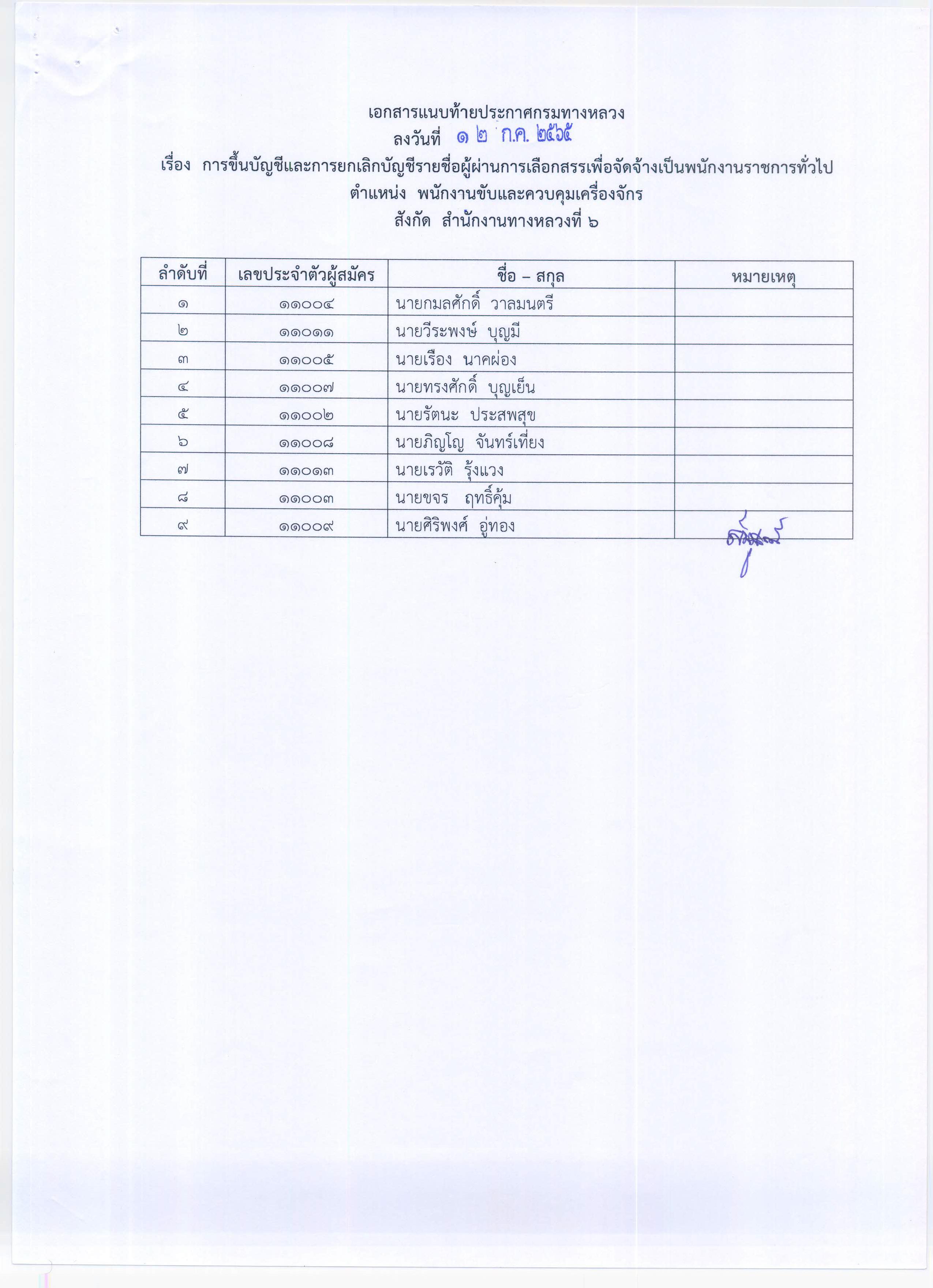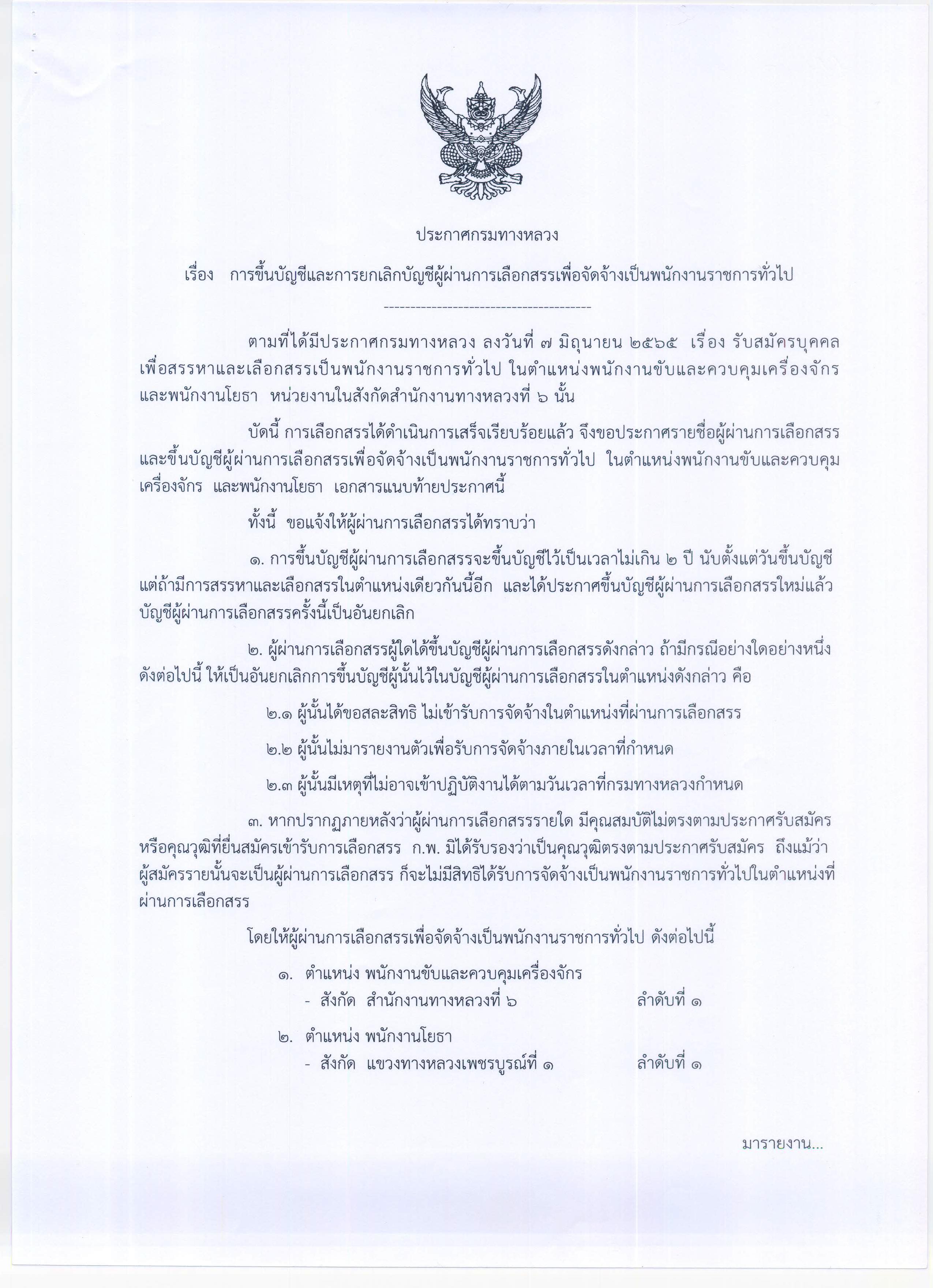 สำนักงานทางหลวงที่ 6 (เพชรบูรณ์) ประกาศผลสอบผู้ผ่านการเลือกสรรเพื่อจัดจ้างเป็นพนักงานราชการทั่วไป ตำแหน่งพนักงานโยธา, ตำแหน่งพนักงานขับและควบคุมเครื่องจักร