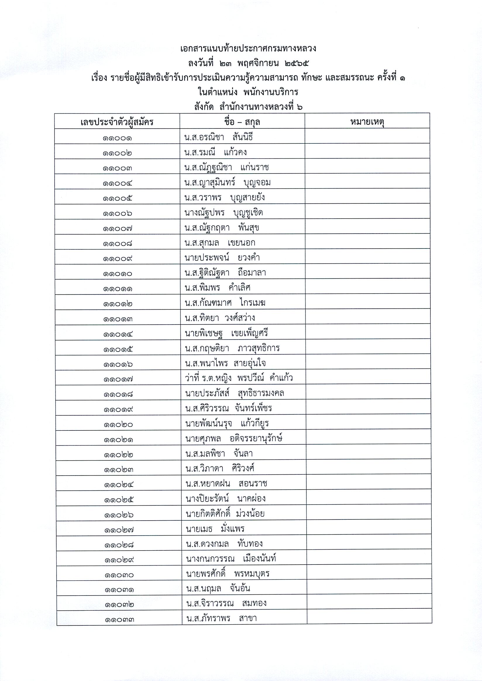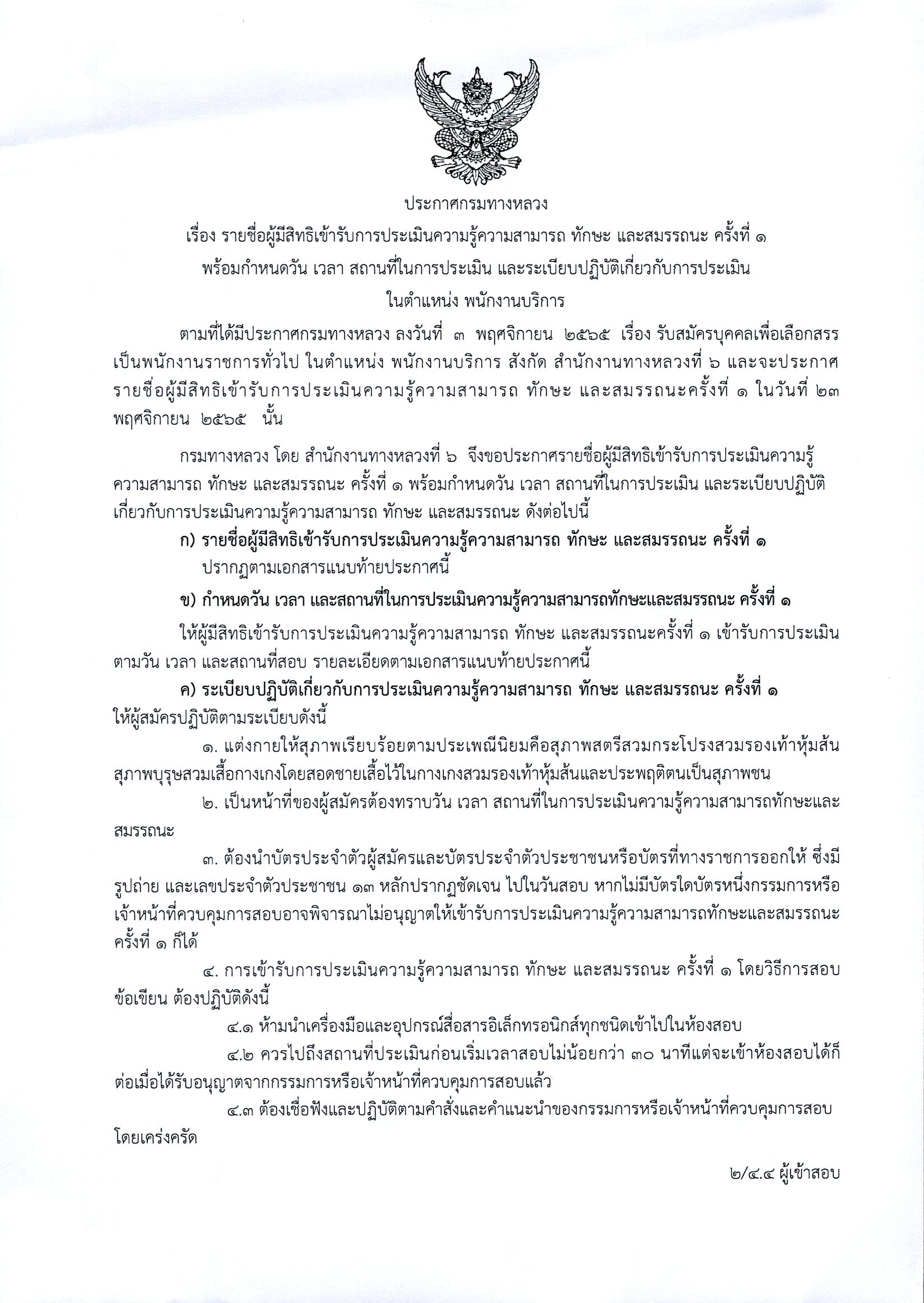 สำนักงานทางหลวงที่ 6 (เพชรบูรณ์) ประกาศรายชื่อผู้มีสิทธิเข้ารับการประเมินสมรรถนะครั้งที่ 1 ตำแหน่งพนักงานบริการ