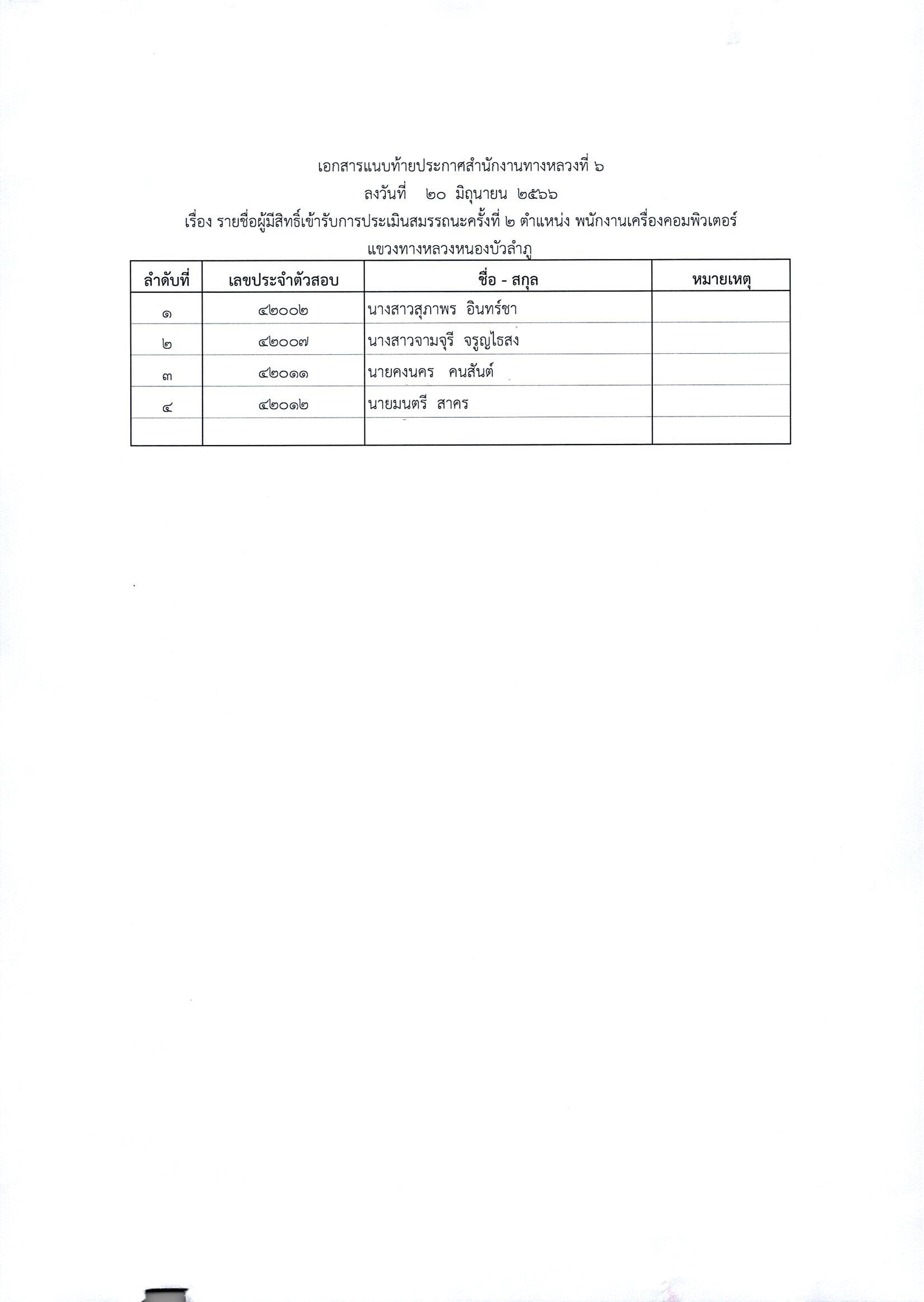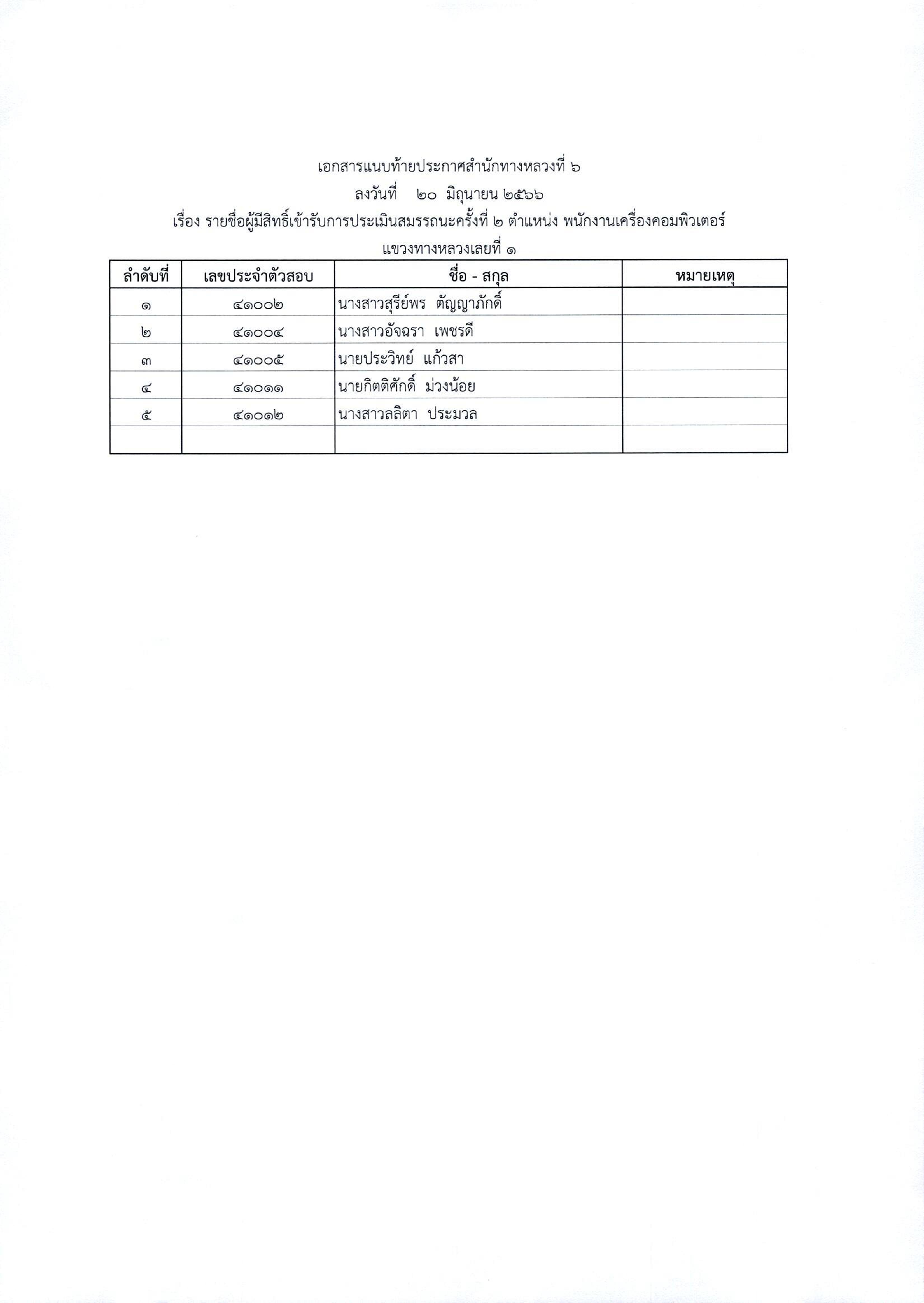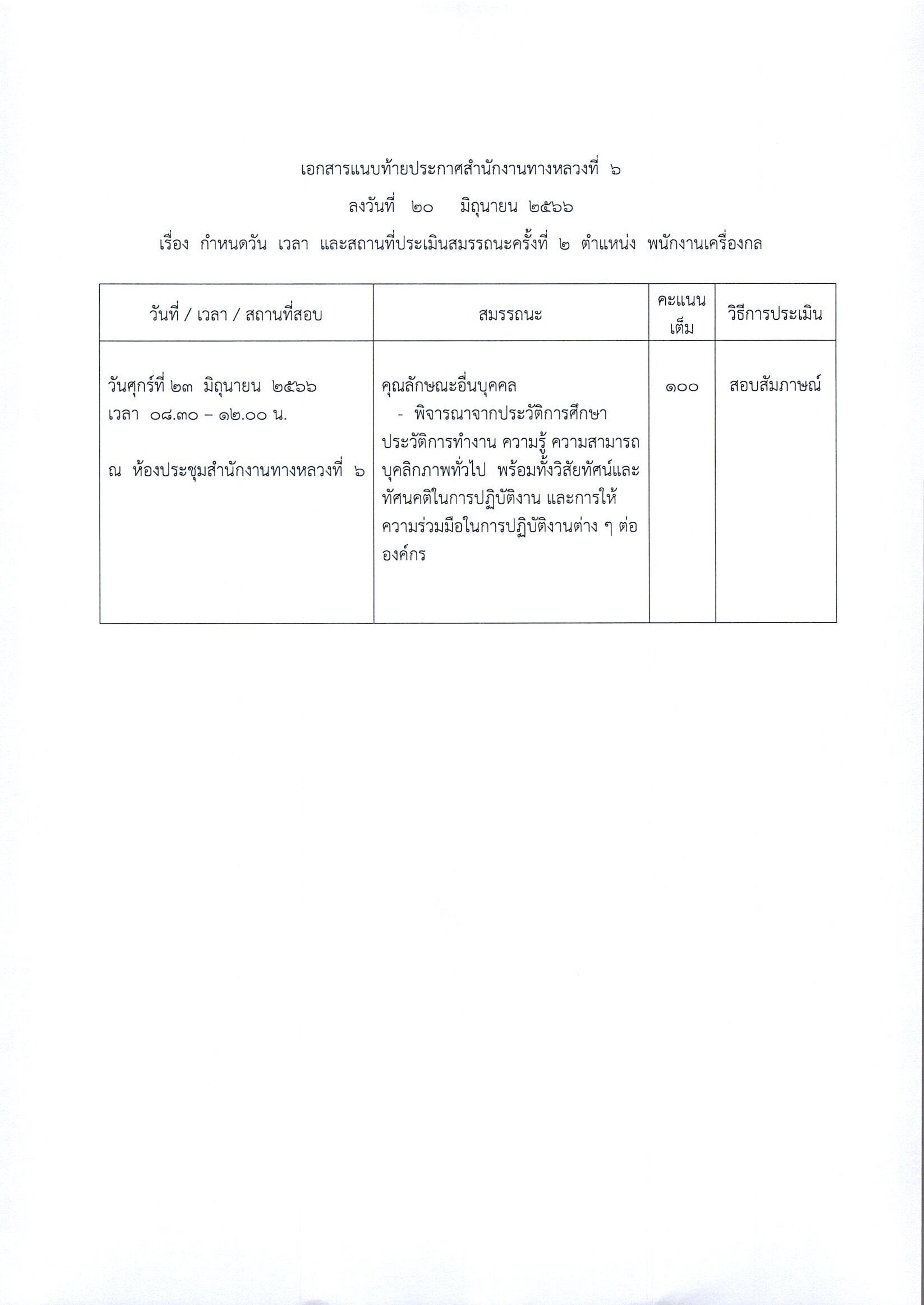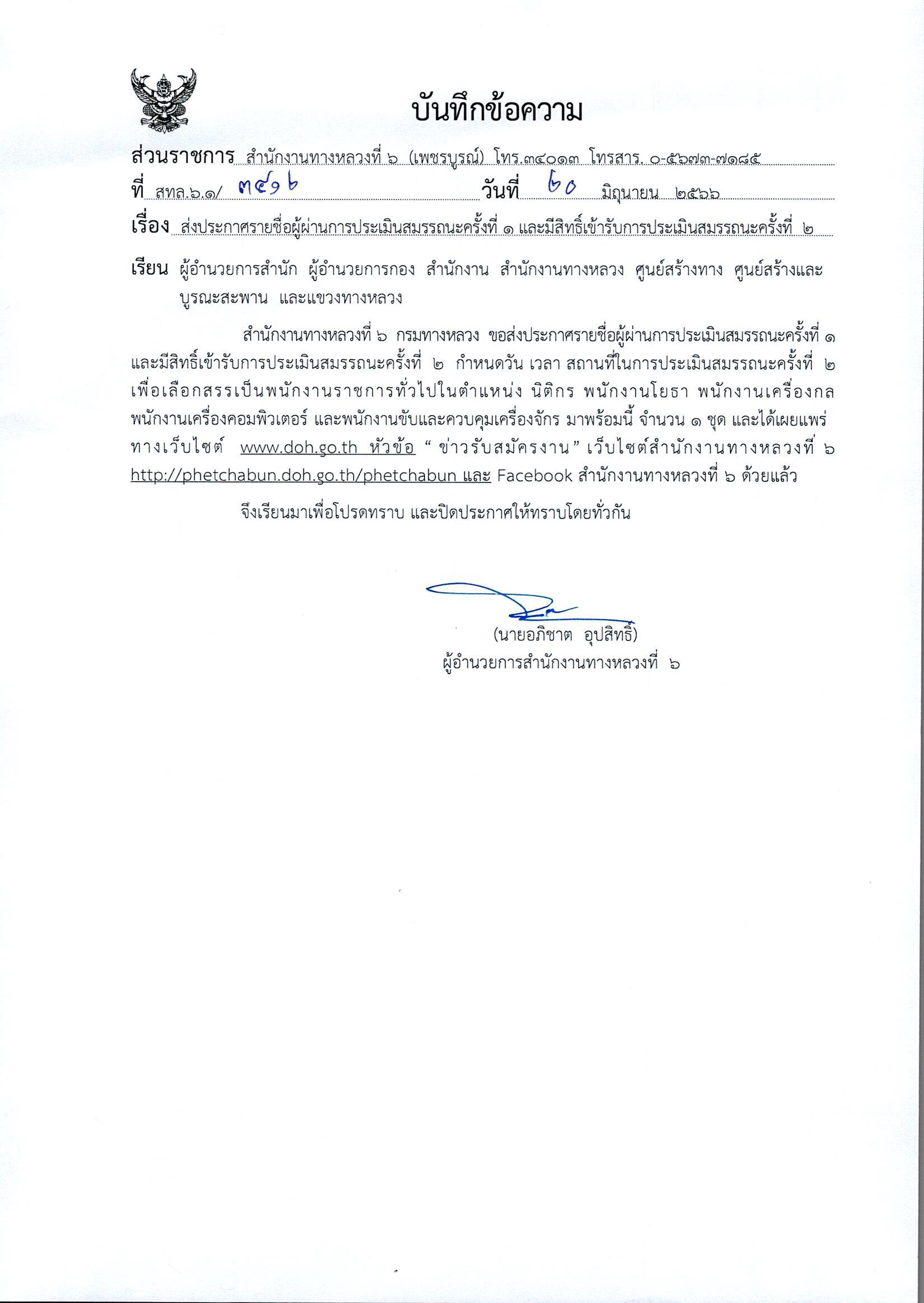 สำนักงานทางหลวงที่ 6 (เพชรบูรณ์) ประกาศรายชื่อผู้ผ่านการประเมินสมรรถนะครั้งที่ 1 และกำหนดวัน เวลา สถานที่ในการประเมินสมรรถนะครั้งที่ 2 ตำแหน่งนิติกร, พนักงานโยธา, พนักงานเครื่องกล, พนักงานเครื่องคอมพิวเตอร์, พนักงานขับและควบคุมเครื่องจักร