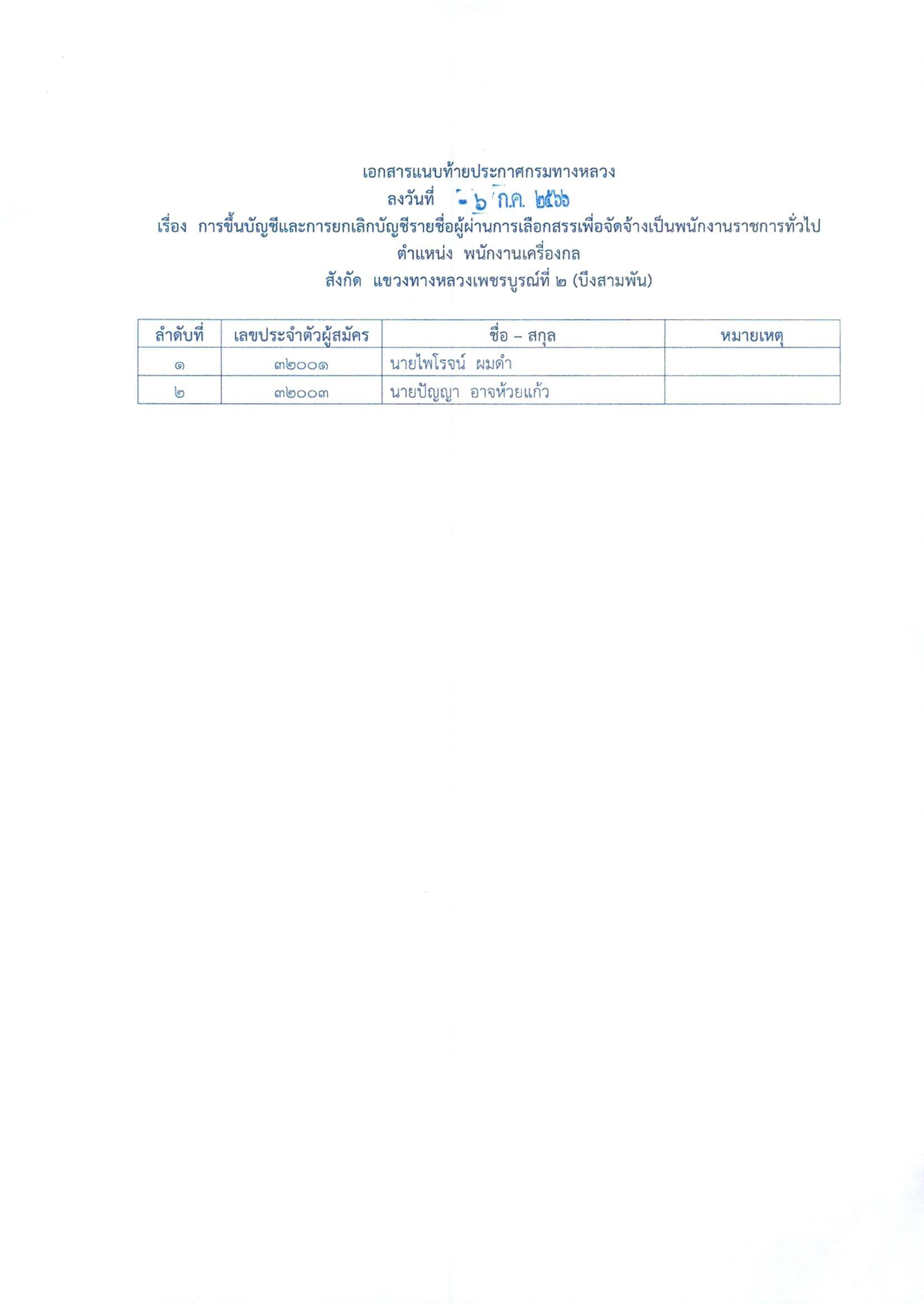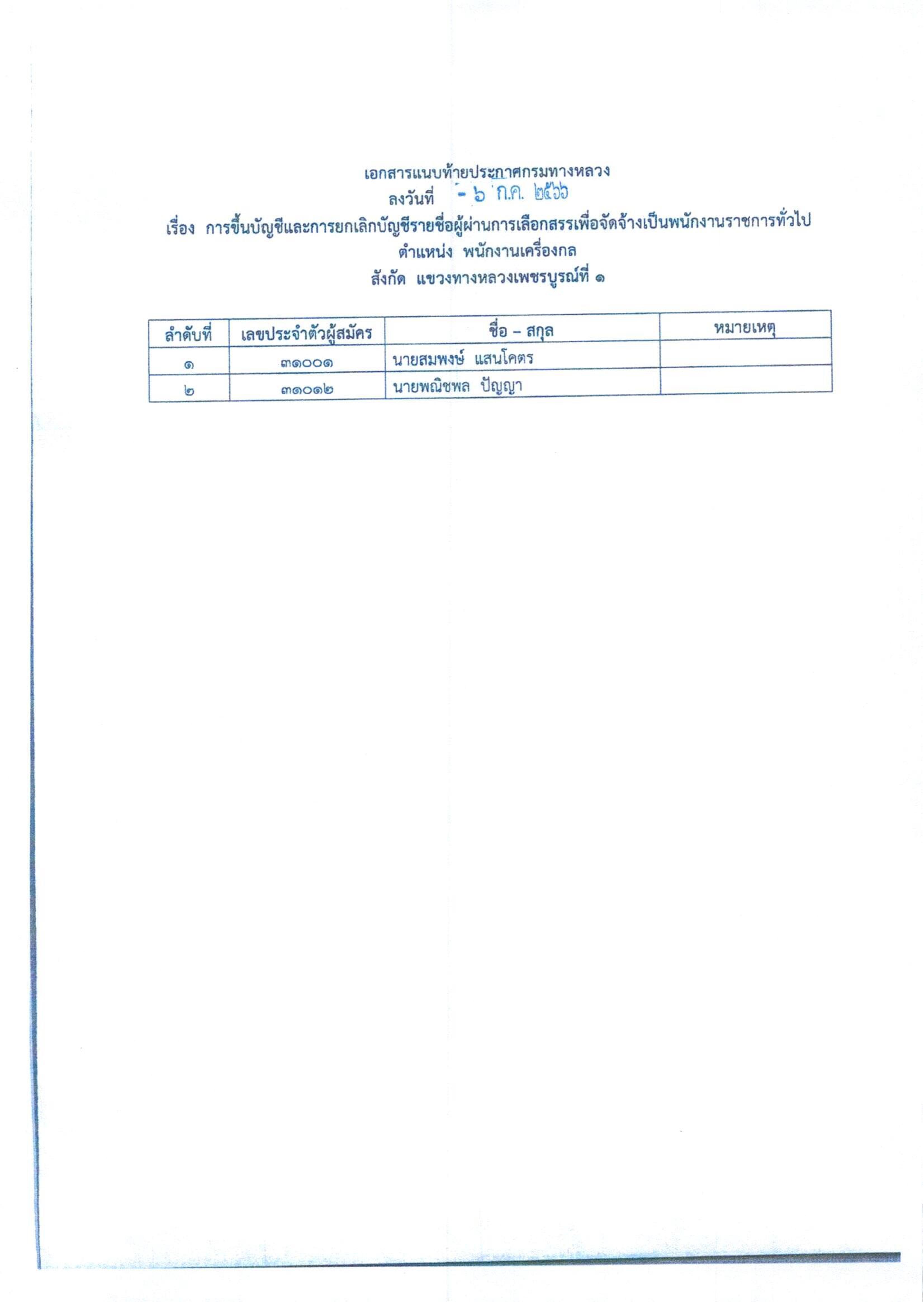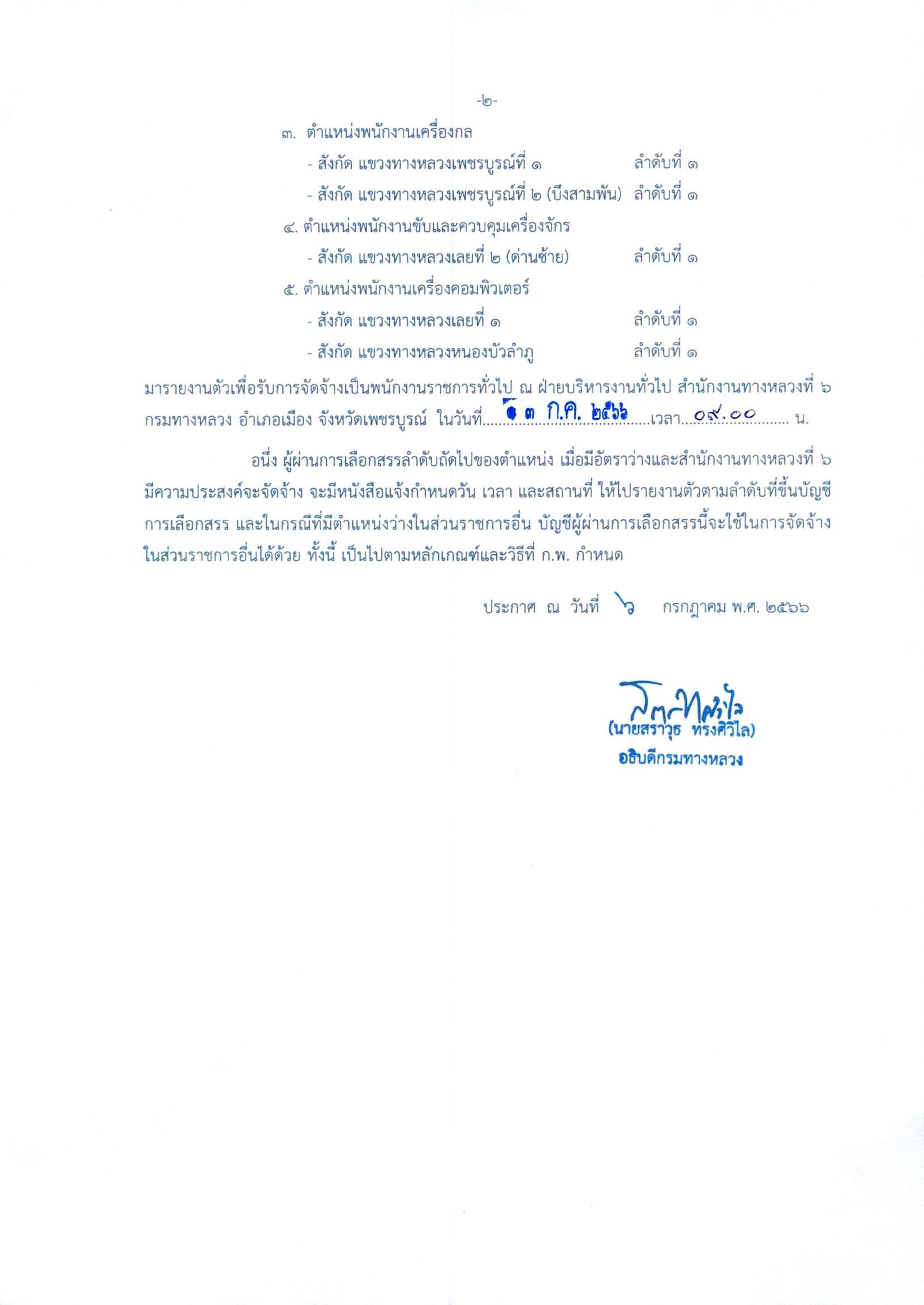 สำนักงานทางหลวงที่ 6 (เพชรบูรณ์) ประกาศผลสอบผู้ผ่านการเลือกสรรเพื่อจัดจ้างเป็นพนักงานราชการทั่วไป ตำแหน่ง นิติกร, พนักงานโยธา, พนักงานเครื่องกล, พนักงานเครื่องคอมพิวเตอร์, พนักงานขับและควบคุมเครื่องจักร