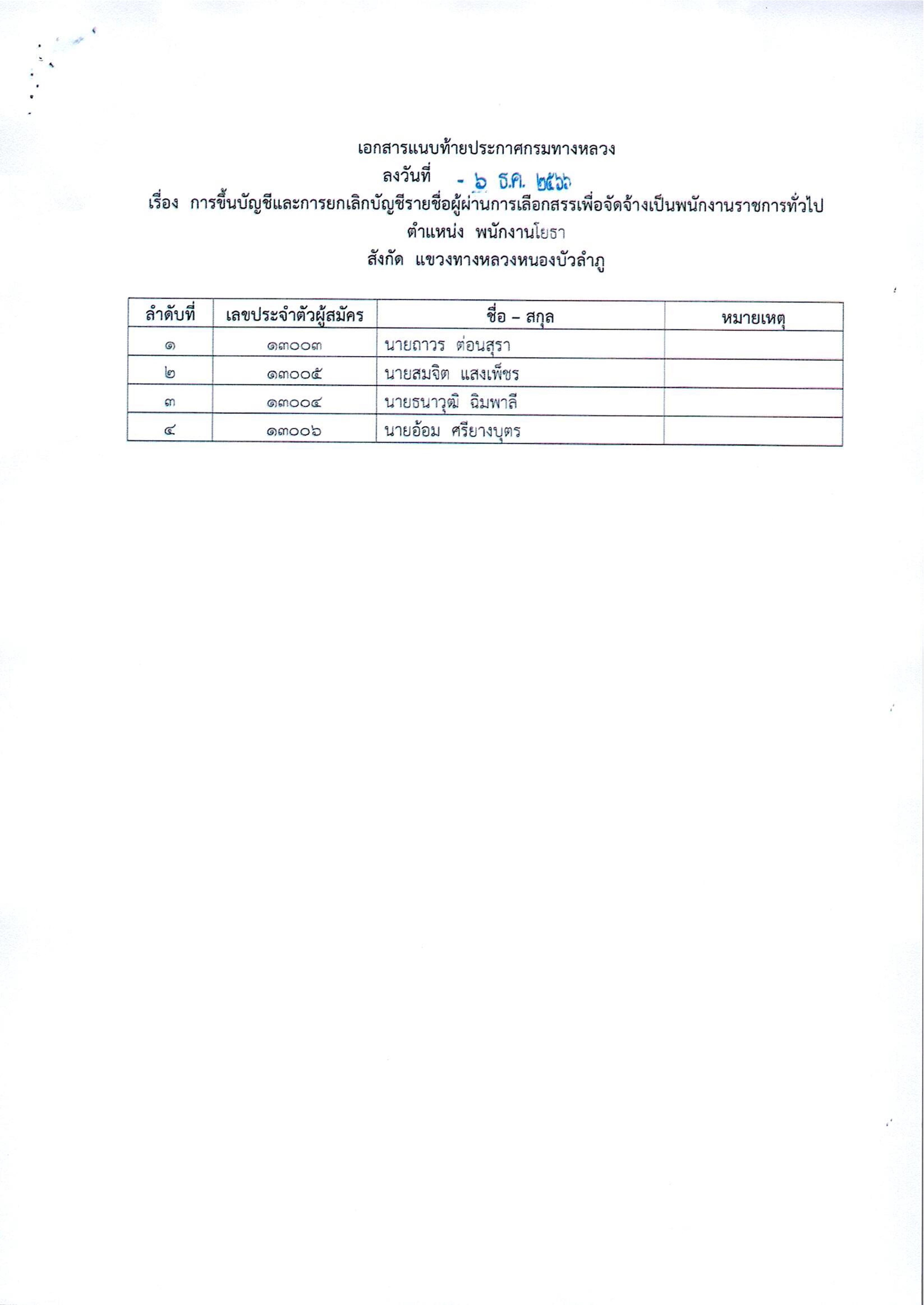 ประกาศขึ้นบัญชีและยกเลิกบัญชีรายชื่อผู้ผ่านการเลือกสรรเพื่อจัดจ้างเป็นพนักงานราชการทั่วไป