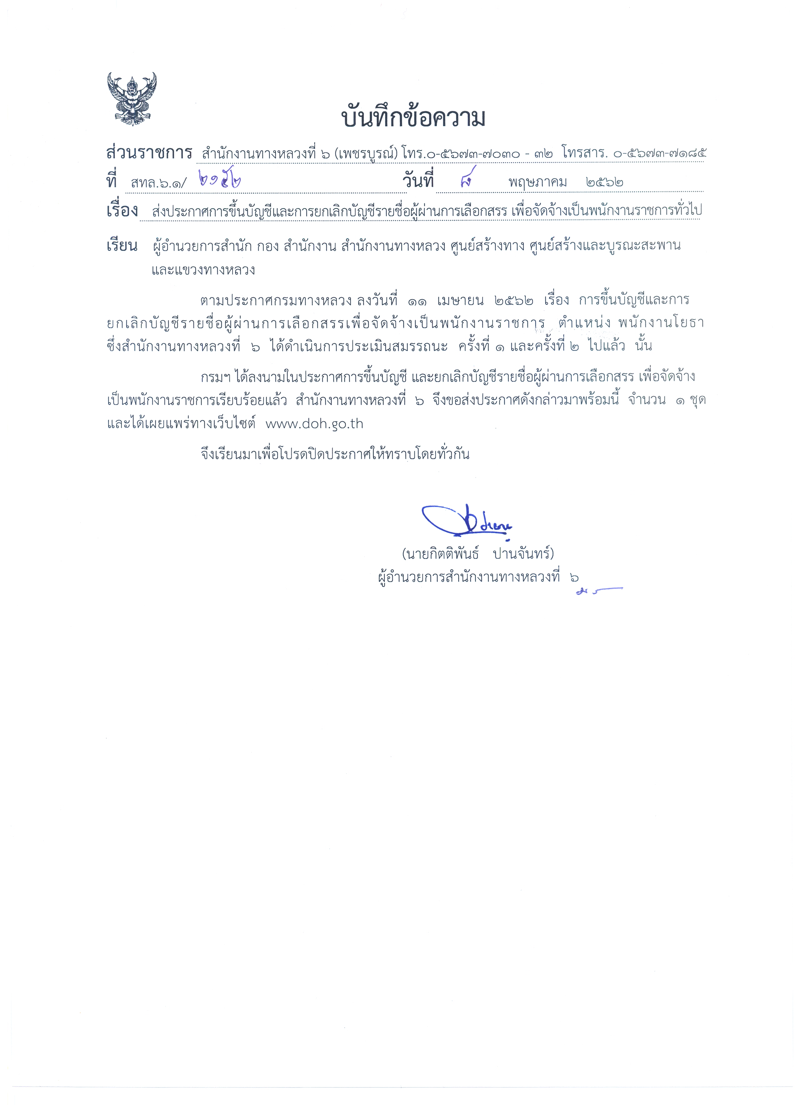สำนักงานทางหลวงที่ 6 (เพชรบูรณ์) ประกาศรายชื่อผู้ผ่านการเลือกสรรเพื่อจัดจ้างเป็นพนักงานราชการทั่วไป ตำแหน่งพนักงานโยธา