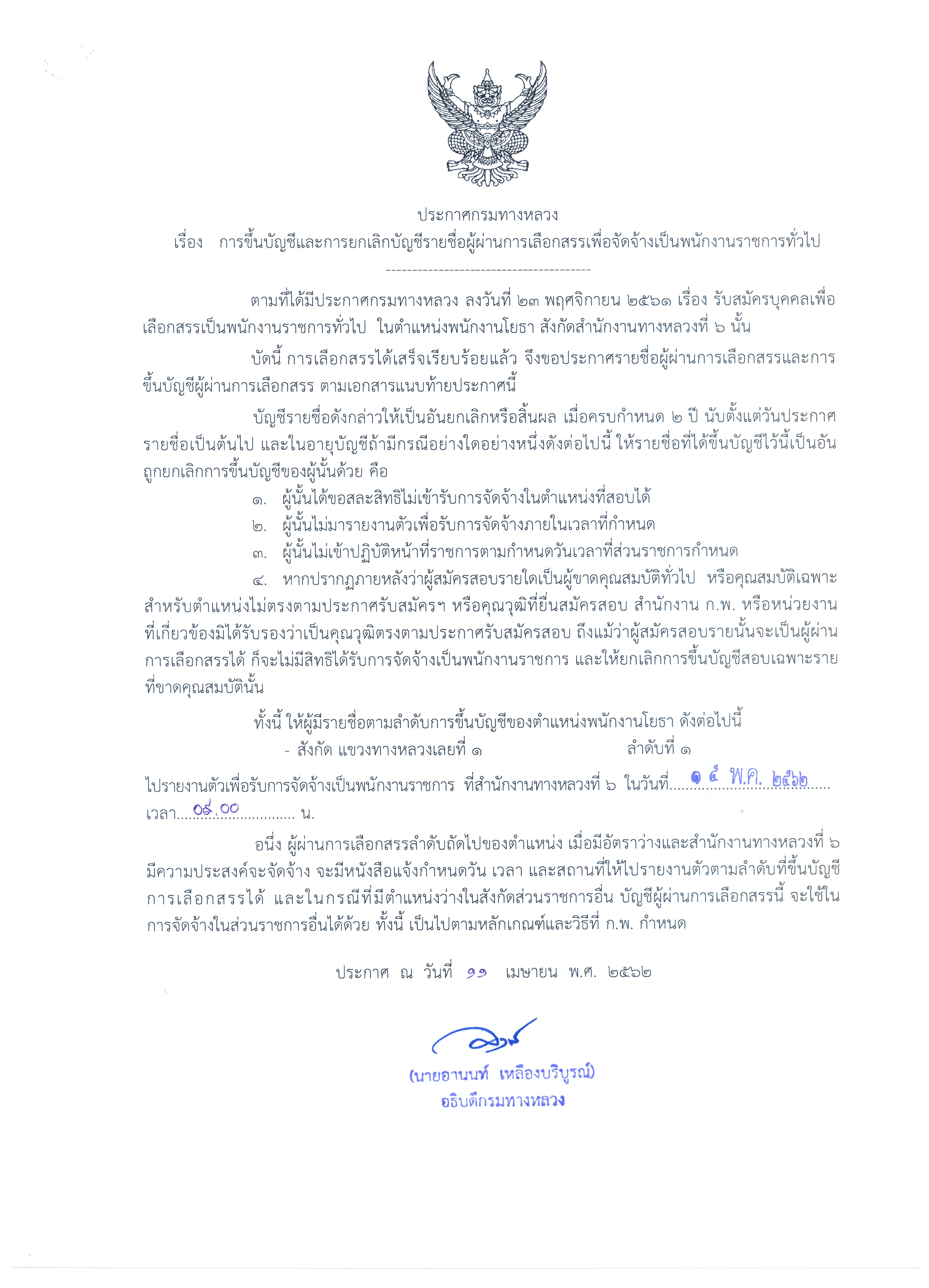 ประกาศขึ้นบัญชีและยกเลิกบัญชีรายชื่อผู้ผ่านการเลือกสรรเพื่อจัดจ้างเป็นพนักงานราชการทั่วไป