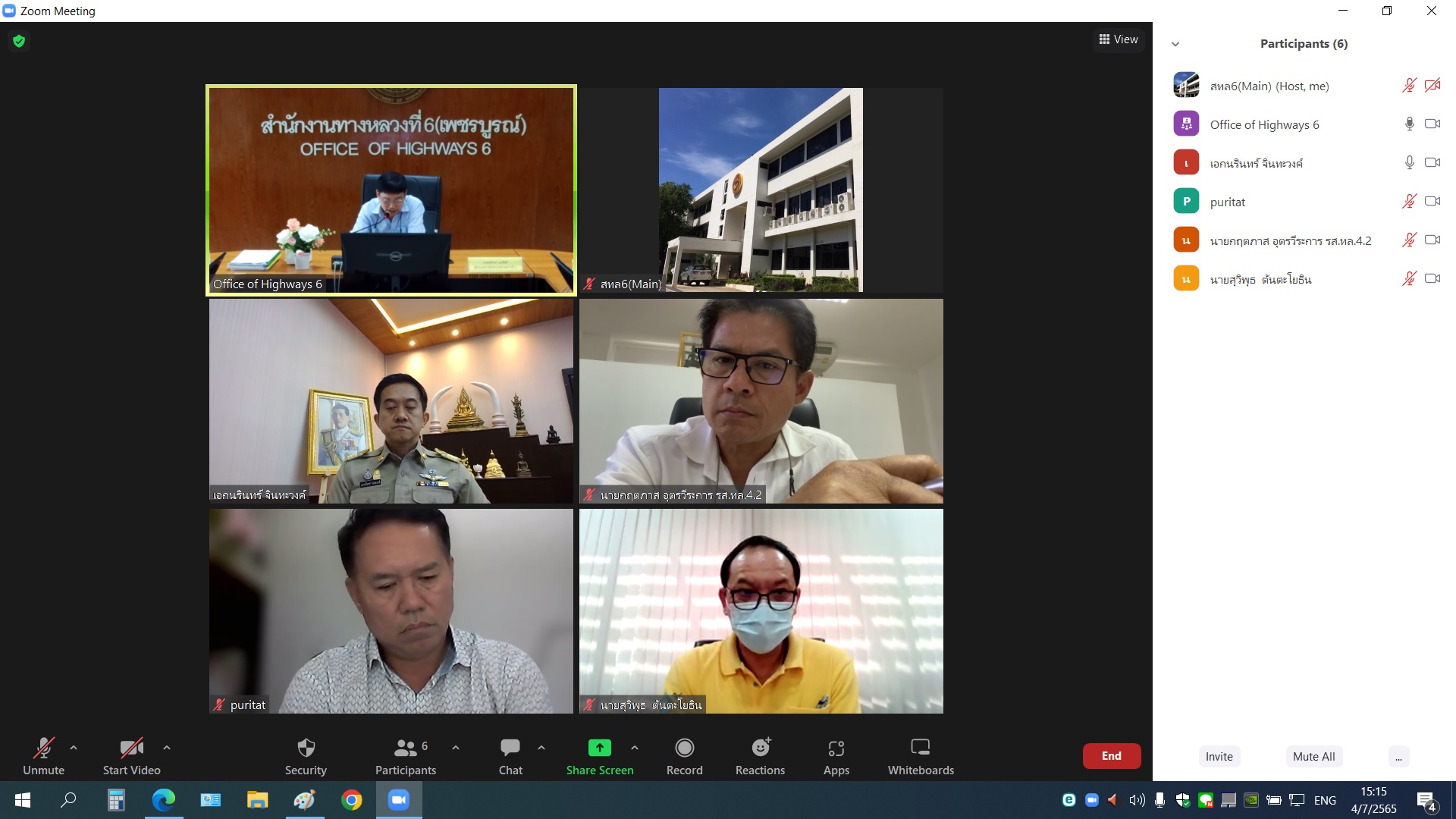 วันที่ 4 กรกฎาคม 2565 เวลา 15.00 น. นายอภิชาต อุปสิทธิ์ ผู้อำนวยการสำนักงานทางหลวงที่ 6 เป็นประธานคณะอนุกรรมการฯ สรุปการประเมินผลงานบำรุงทาง งานอำนวยความปลอดภัย ของผู้ที่ได้รับ การเสนอรายชื่อจากสำนักงานทางหลวง กลุ่มที่ 1 ภาคเหนือ ประจำภาคปี 2565 ผ่านการประชุมทางไกล ด้วยระบบ Zoom Cloud Meeting ณ ห้องประชุม ชั้น 3 สำนักงานทางหลวงที่ 6 (เพชรบูรณ์)