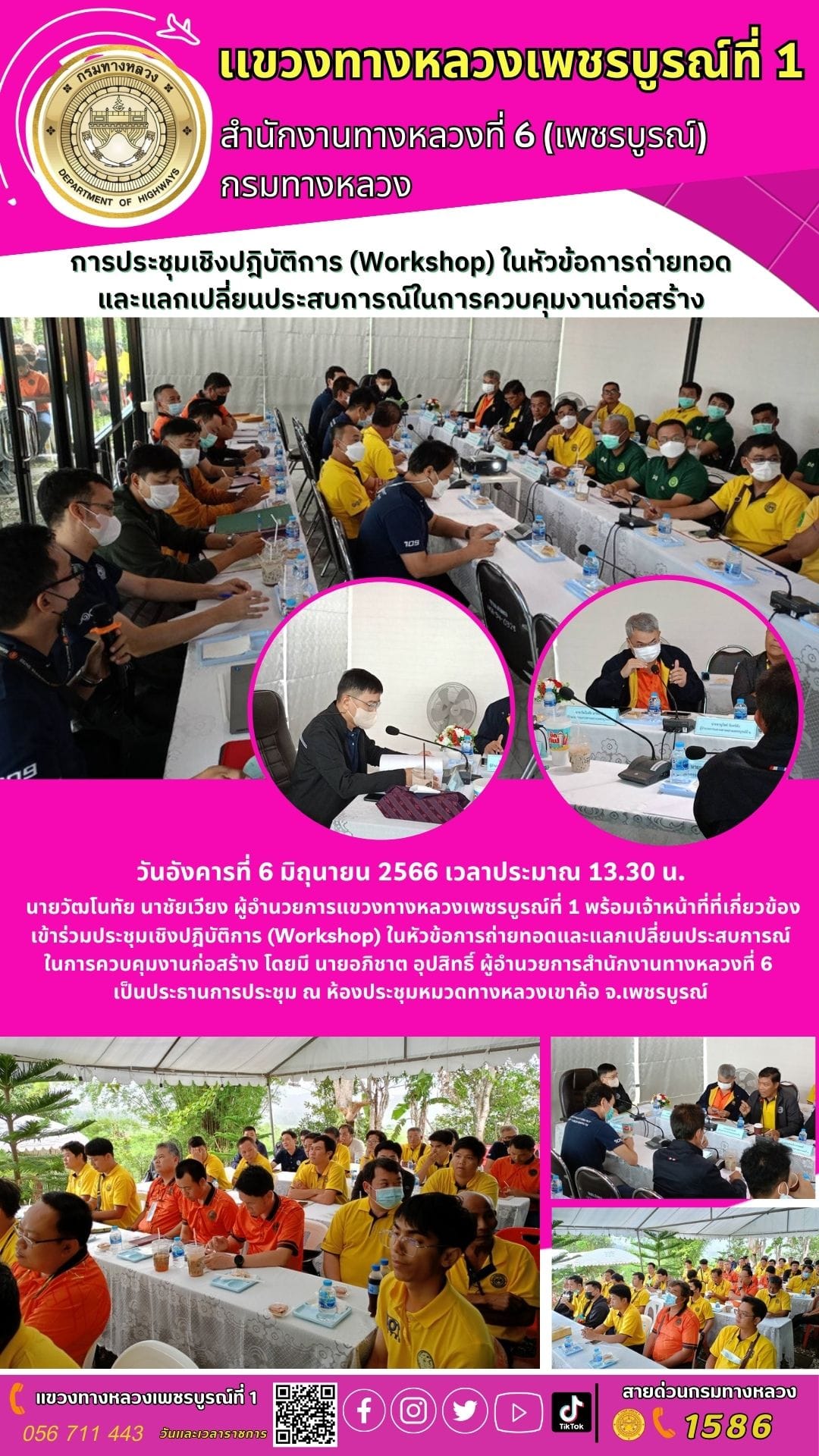 การฝึกอบรมเชิงปฏิบัติการ หลักสูตรการบริหารความปลอดภัยในพื้นที่งานบำรุงรักษาทางหลวง (ภาคทฤษฎี) รุ่นที่ 16 สำหรับหมวดทางหลวงในสังกัดสำนักงานทางหลวงที่ 6 (เพชรบูรณ์) ผ่านระบบ Zoom Cloud Meeting มายังส่วนภูมิภาค