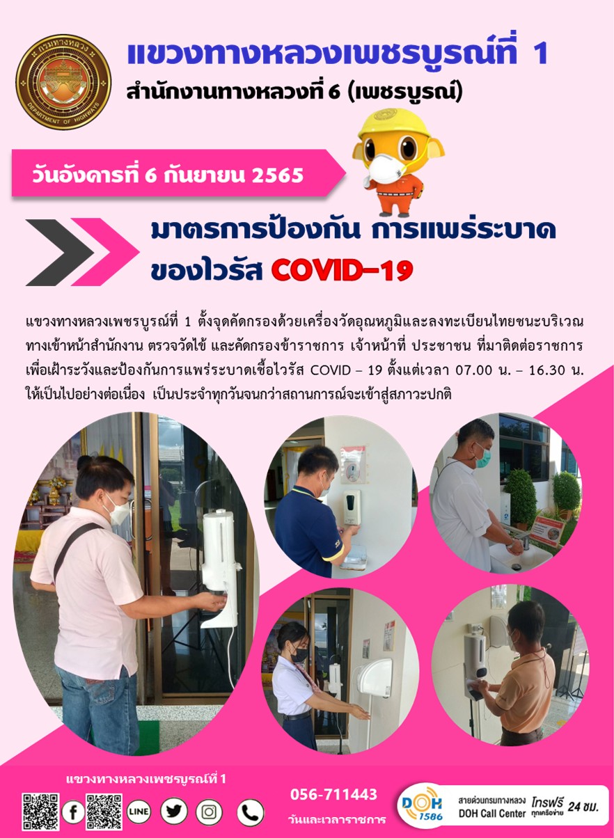 วันอังคารที่ 6 กันยายน 2565 แขวงทางหลวงเพชรบูรณ์ที่ 1 ตั้งจุดคัดกรองด้วยเครื่องวัดอุณหภูมิและลงทะเบียนไทยชนะบริเวณทางเข้าหน้าสำนักงาน ตรวจวัดไข้ และคัดกรองข้าราชการ เจ้าหน้าที่ ประชาชน ที่มาติดต่อราชการเพื่อเฝ้าระวังและป้องกันการแพร่ระบาดเชื้อไวรัส COVID – 19