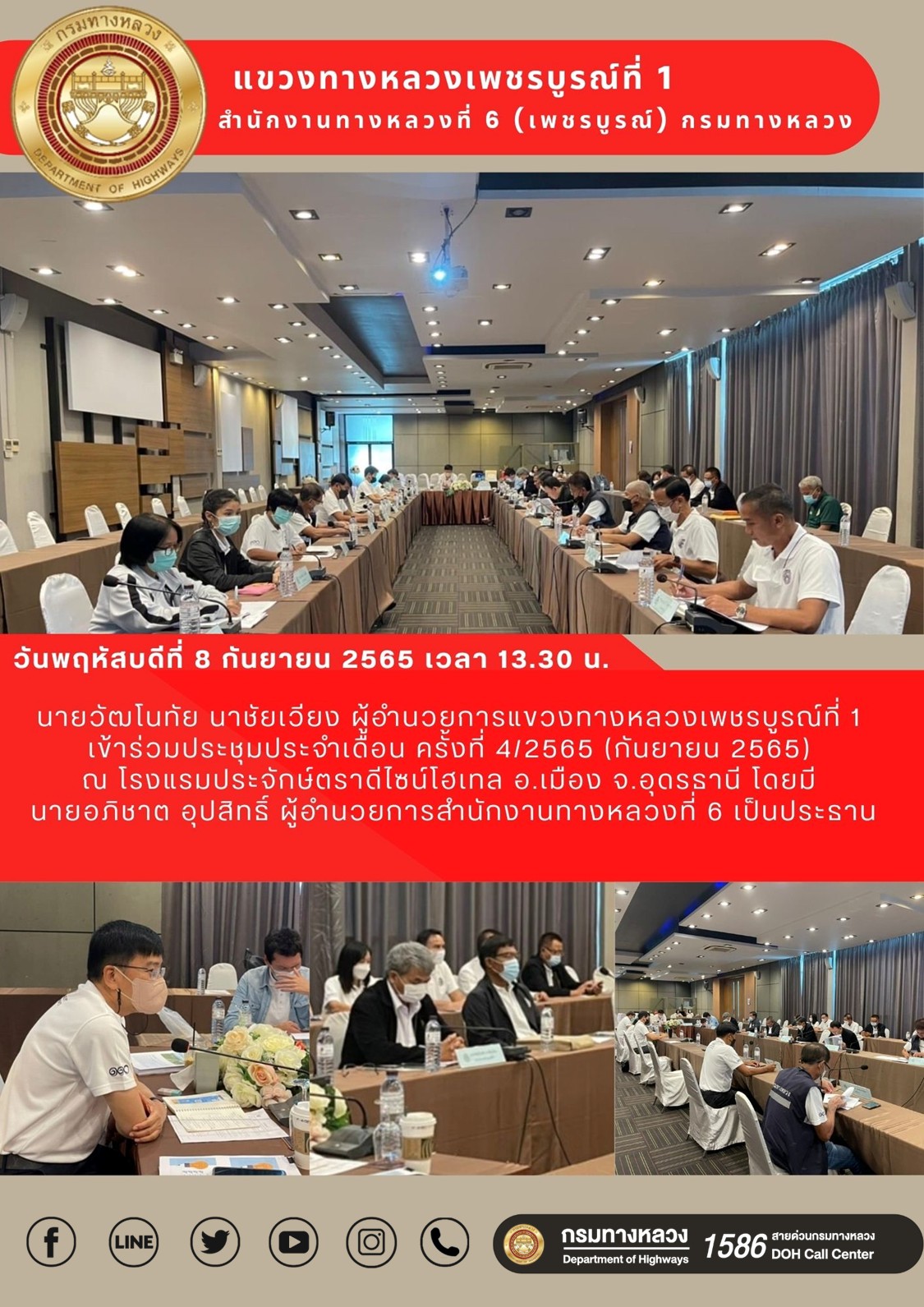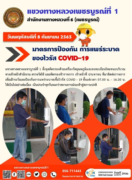 วันพฤหัสบดีที่ 8 กันยายน 2565 แขวงทางหลวงเพชรบูรณ์ที่ 1 ตั้งจุดคัดกรองด้วยเครื่องวัดอุณหภูมิและลงทะเบียนไทยชนะบริเวณทางเข้าหน้าสำนักงาน ตรวจวัดไข้ และคัดกรองข้าราชการ เจ้าหน้าที่ ประชาชน ที่มาติดต่อราชการเพื่อเฝ้าระวังและป้องกันการแพร่ระบาดเชื้อไวรัส COVID – 19