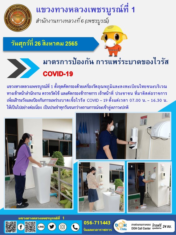 วันศุกร์ที่ 26 สิงหาคม 2565 แขวงทางหลวงเพชรบูรณ์ที่ 1 ตั้งจุดคัดกรองด้วยเครื่องวัดอุณหภูมิและลงทะเบียนไทยชนะบริเวณทางเข้าหน้าสำนักงาน ตรวจวัดไข้ และคัดกรองข้าราชการ เจ้าหน้าที่ ประชาชน ที่มาติดต่อราชการเพื่อเฝ้าระวังและป้องกันการแพร่ระบาดเชื้อไวรัส COVID – 19