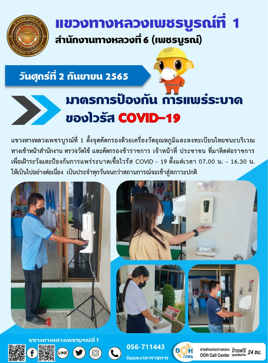 วันพฤหัสบดีที่ 1 กันยายน 2565 แขวงทางหลวงเพชรบูรณ์ที่ 1 ตั้งจุดคัดกรองด้วยเครื่องวัดอุณหภูมิและลงทะเบียนไทยชนะบริเวณทางเข้าหน้าสำนักงาน ตรวจวัดไข้ และคัดกรองข้าราชการ เจ้าหน้าที่ ประชาชน ที่มาติดต่อราชการเพื่อเฝ้าระวังและป้องกันการแพร่ระบาดเชื้อไวรัส COVID – 19