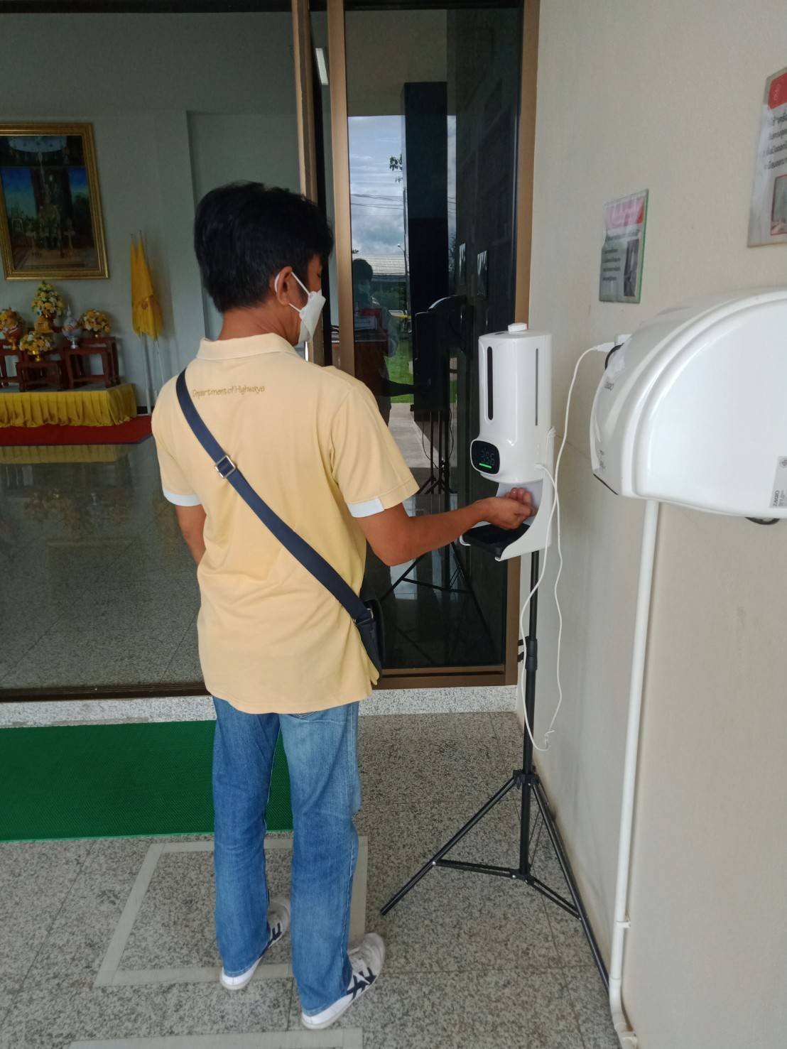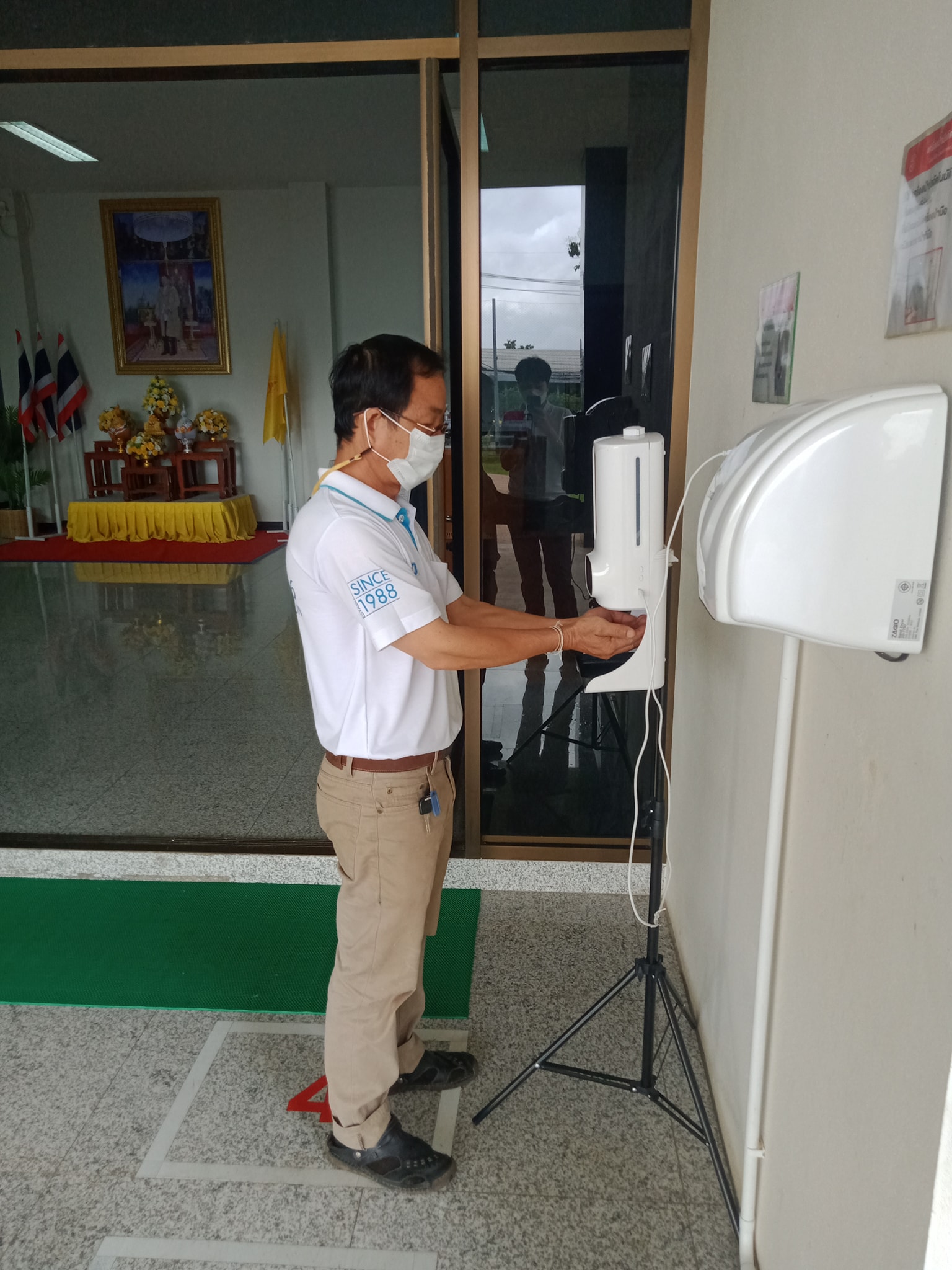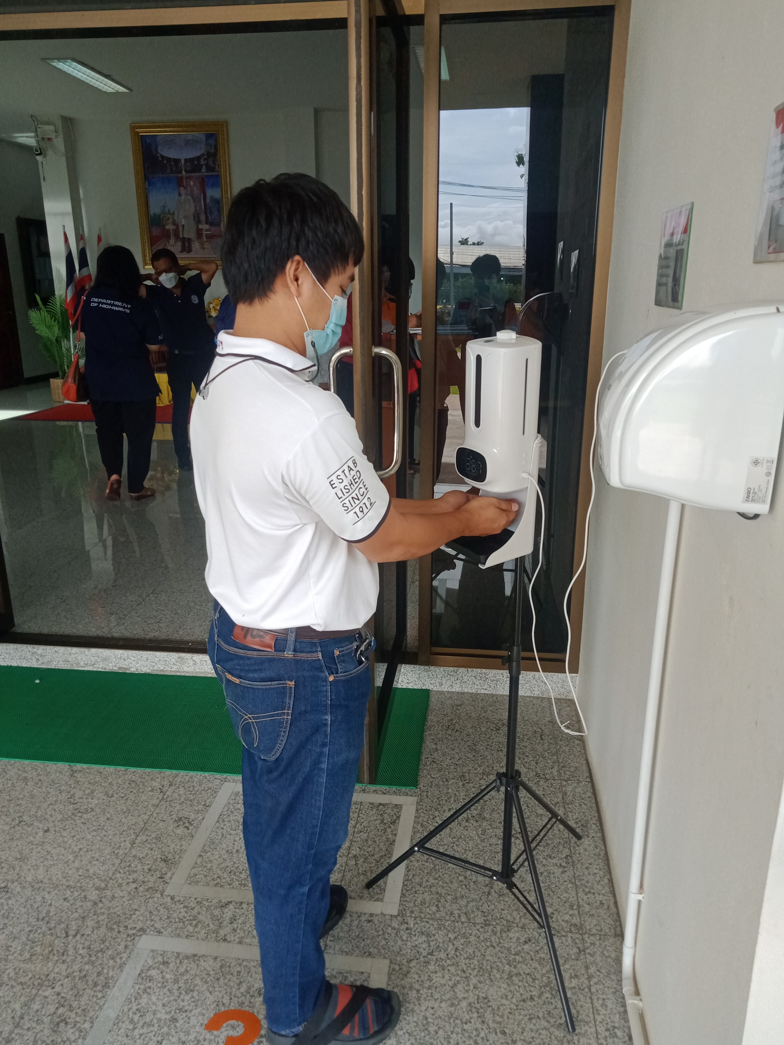 ตั้งจุดคัดกรองด้วยเครื่องวัดอุณหภูมิและลงทะเบียนไทยชนะ บริเวณทางเข้าหน้าสำนักงาน ตรวจวัดไข้ และคัดกรองข้าราชการ เจ้าหน้าที่ ประชาชน ที่มาติดต่อราชการ เพื่อเฝ้าระวังและป้องกันการแพร่ระบาดเชื้อไวรัส COVID – 19