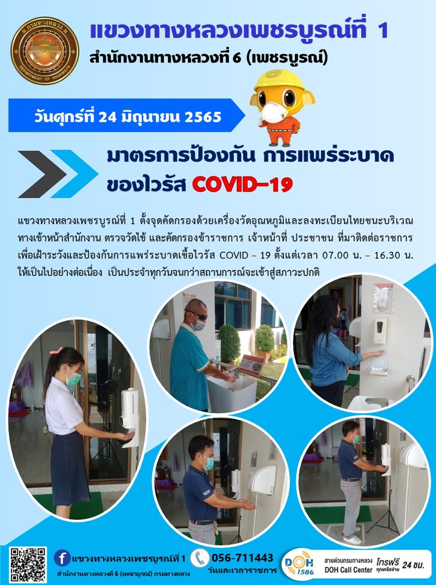 วันศุกร์ที่ 24 มิถุนายน 2565 แขวงทางหลวงเพชรบูรณ์ที่ 1 ตั้งจุดคัดกรองด้วยเครื่องวัดอุณหภูมิและลงทะเบียนไทยชนะ