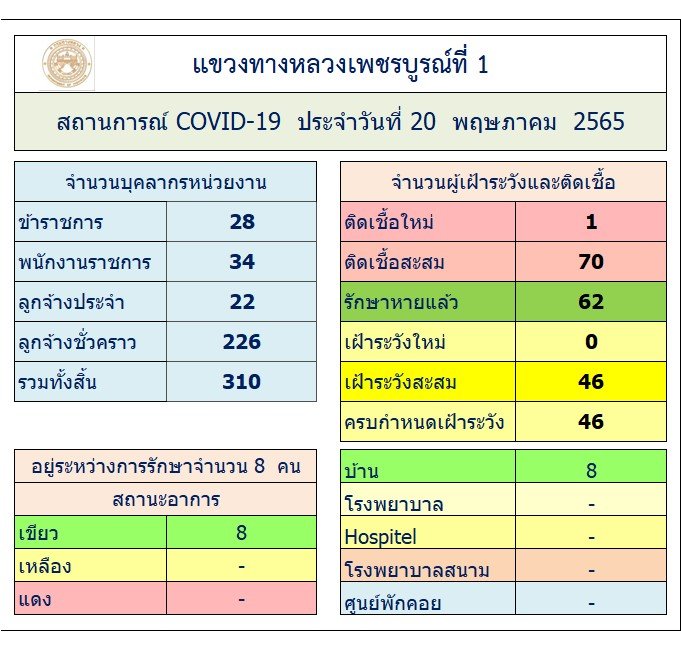 รายงานสถานการณ์ COVID-19 แขวงทางหลวงเพชรบูรณ์ที่ 1 ประจำวันที่ 20 พฤษภาคม 2565