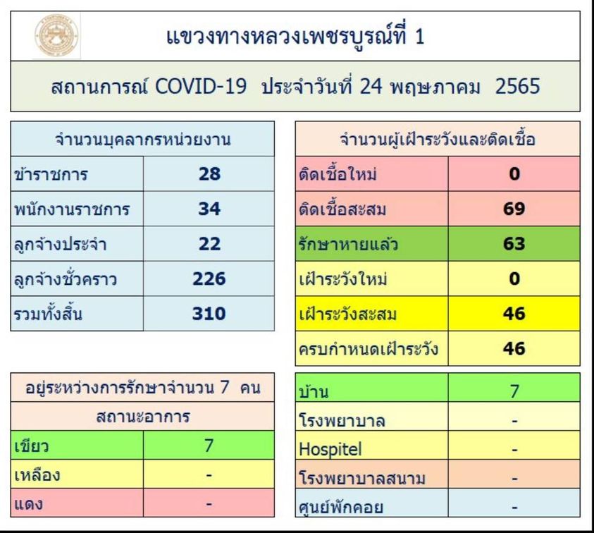 รายงานสถานการณ์ COVID-19 แขวงทางหลวงเพชรบูรณ์ที่ 1 ประจำวันที่ 24 พฤษภาคม 2565