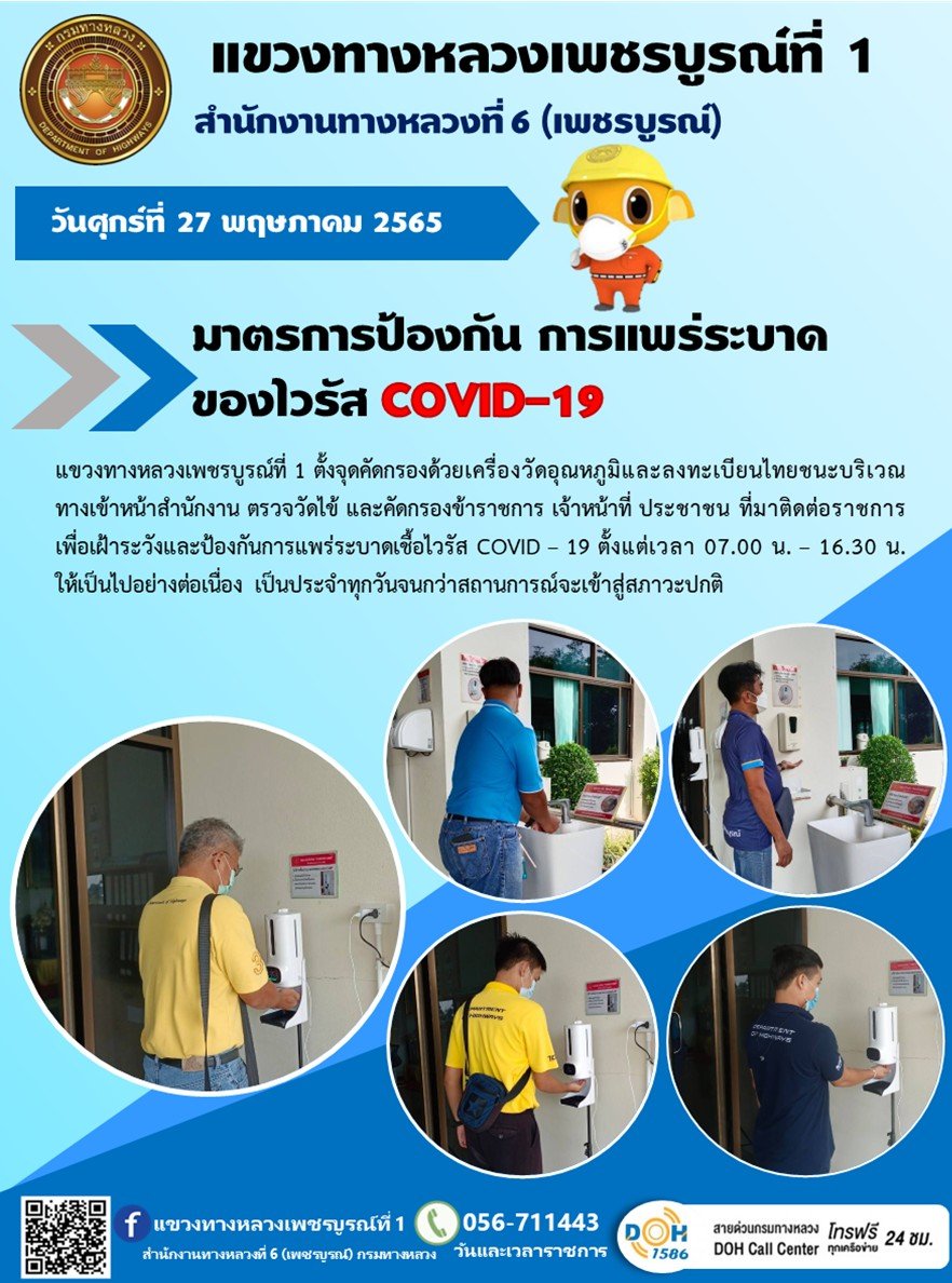 วันศุกร์ที่ 27 พฤษภาคม 2565 แขวงทางหลวงเพชรบูรณ์ที่ 1 ตั้งจุดคัดกรองด้วยเครื่องวัดอุณหภูมิและลงทะเบียนไทยชนะ