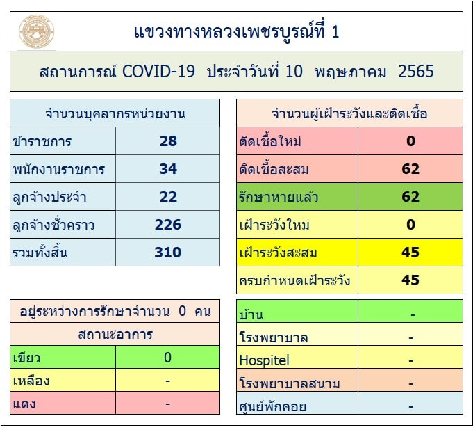 รายงานสถานการณ์ COVID-19 แขวงทางหลวงเพชรบูรณ์ที่ 1 ประจำวันที่ 10 พฤษภาคม 2565