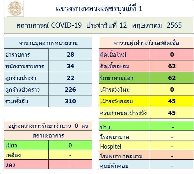 รายงานสถานการณ์ COVID-19 แขวงทางหลวงเพชรบูรณ์ที่ 1 ประจำวันที่ 12 พฤษภาคม 2565