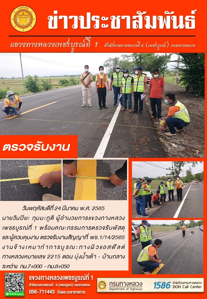 ตรวจรับงานสัญญาที่ พช.1/13/2565 งานจ้างเหมาทำการ งานบูรณะทางผิวแอสฟัลต์ ทางหลวงหมายเลข 2196 ตอน นางั่ว-ทุ่งสมอ ระหว่าง กม.24+230 - กม.26+900