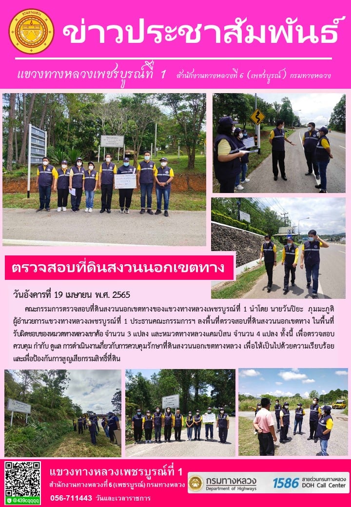 ณะกรรมการตรวจสอบที่ดินสงวนนอกเขตทางของแขวงทางหลวงเพชรบูรณ์ที่ 1 ลงพื้นที่ตรวจสอบที่ดินสงวนนอกเขตทางในพื้นที่ความรับผิดชอบ แปลงทางขึ้นเขาค้อ ทางหลวงหมาย 2196, แปลงบ่อหินเขาถ้ำครัว, แปลงเขาถ้ำพระ, แปลงบุ่งน้ำเต้า ทางหลวงหมายเลข 21