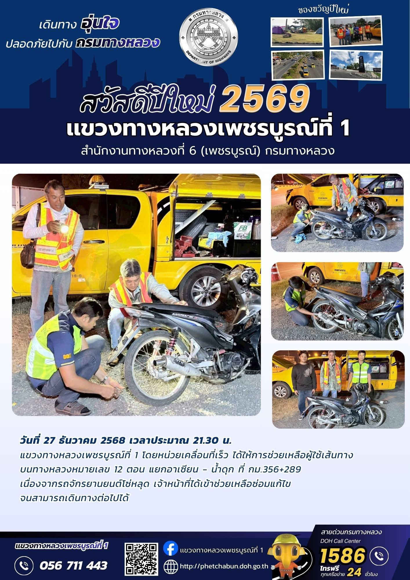 แขวงทางหลวงเพชรบูรณ์ที่ 1 โดยหน่วยเคลื่อนที่เร็ว ได้ให้การช่วยเหลือผู้ขับขี่รถจักรยานยนต์ บนทางหลวงหมายเลข 12 ตอน แยกอาเซียน – น้ำดุก ที่ กม.356+289 (ด้านขวาทาง)