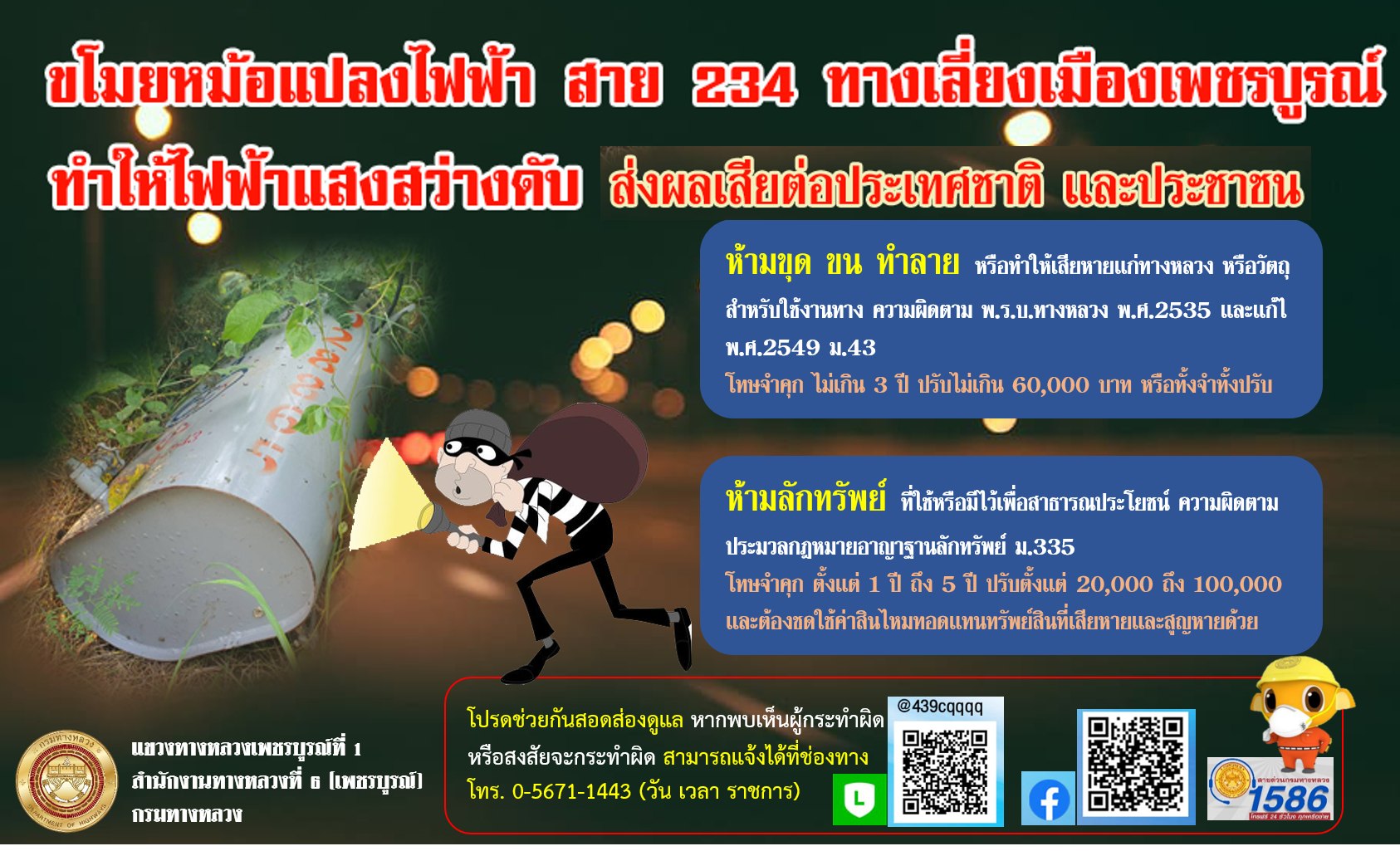 แขวงทางหลวงเพชรบูรณ์ที่1 และเจ้าหน้าที่ตำรวจลงพื้นที่ตรวจสอบจุดที่หม้อแปลงไฟฟ้าถูกโจรกรรม