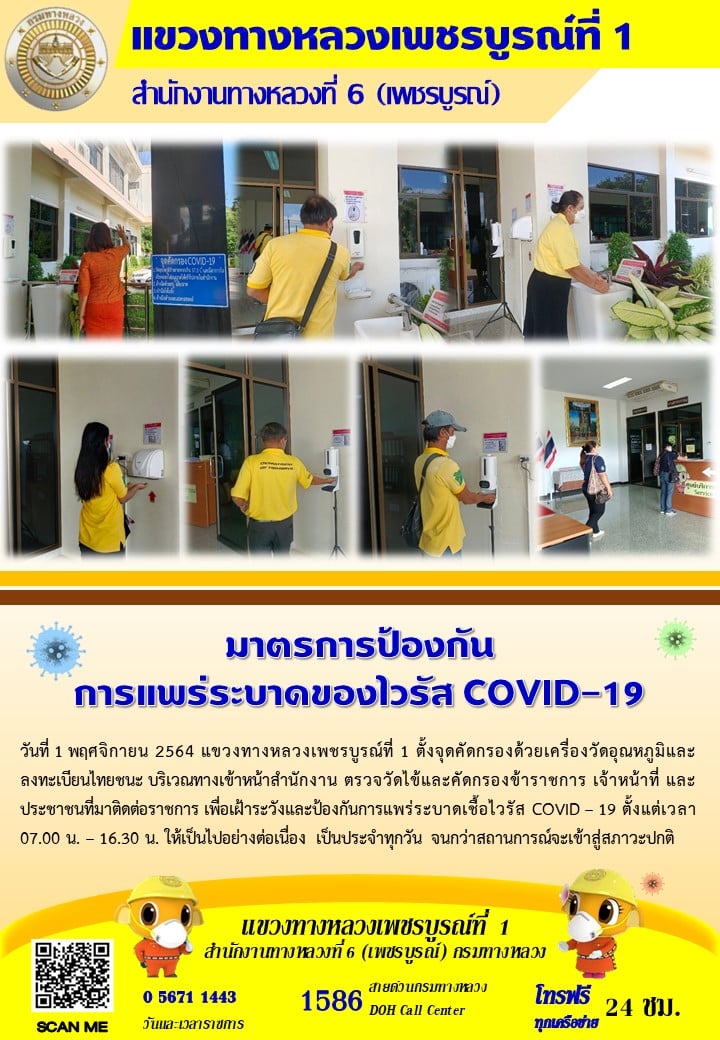 แขวงทางหลวงเพชรบูรณ์ที่ 1 จัดตั้งตู้พ่นน้ำยาฆ่าเชื้อ และจุดคัดกรองด้วยเครื่องวัดอุณหภูมิ วันที่ 1 พฤศจิกายน 2564 ตั้งแต่เวลา 07.00 น. – 16.30 น.