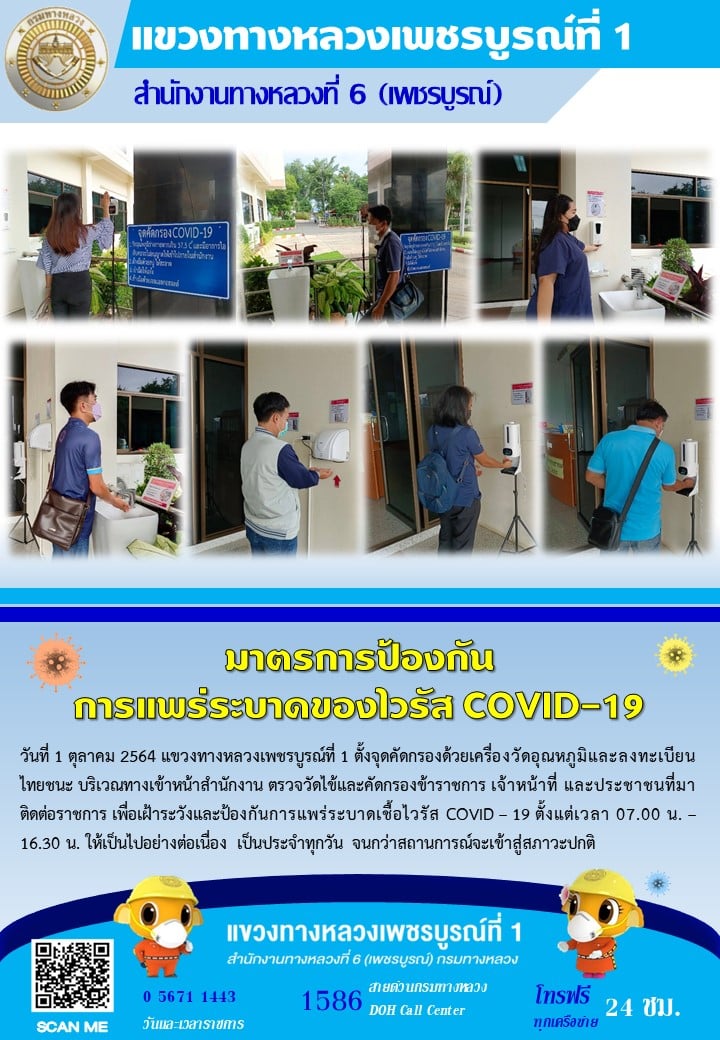 แขวงทางหลวงเพชรบูรณ์ที่ 1 จัดตั้งตู้พ่นน้ำยาฆ่าเชื้อ และจุดคัดกรองด้วยเครื่องวัดอุณหภูมิ วันที่ 1 ตุลาคม 2564 ตั้งแต่เวลา 07.00 น. – 16.30 น.
