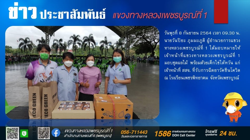 มอบชุดผลไม้พร้อมด้วยเค็กไข่ไต้หวัน แก่เจ้าหน้าที่ สสจ. ที่รับการฉีดยาวัคซีนโควิด ณ โรงเรียนเพชรพิทยาคม จังหวัดเพชรบูรณ์