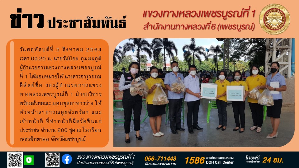 ฝ่ายบริหาร พร้อมด้วยคณะ มอบชุดอาหารว่าง ให้หัวหน้าสาธารณสุขจังหวัดฯ และเจ้าหน้าที่ ที่ทำหน้าที่ฉีดวัคซีนแก่ประชาชน จำนวน 200 ชุด ณ โรงเรียนเพชรพิทยาคม จังหวัดเพชรบูรณ์