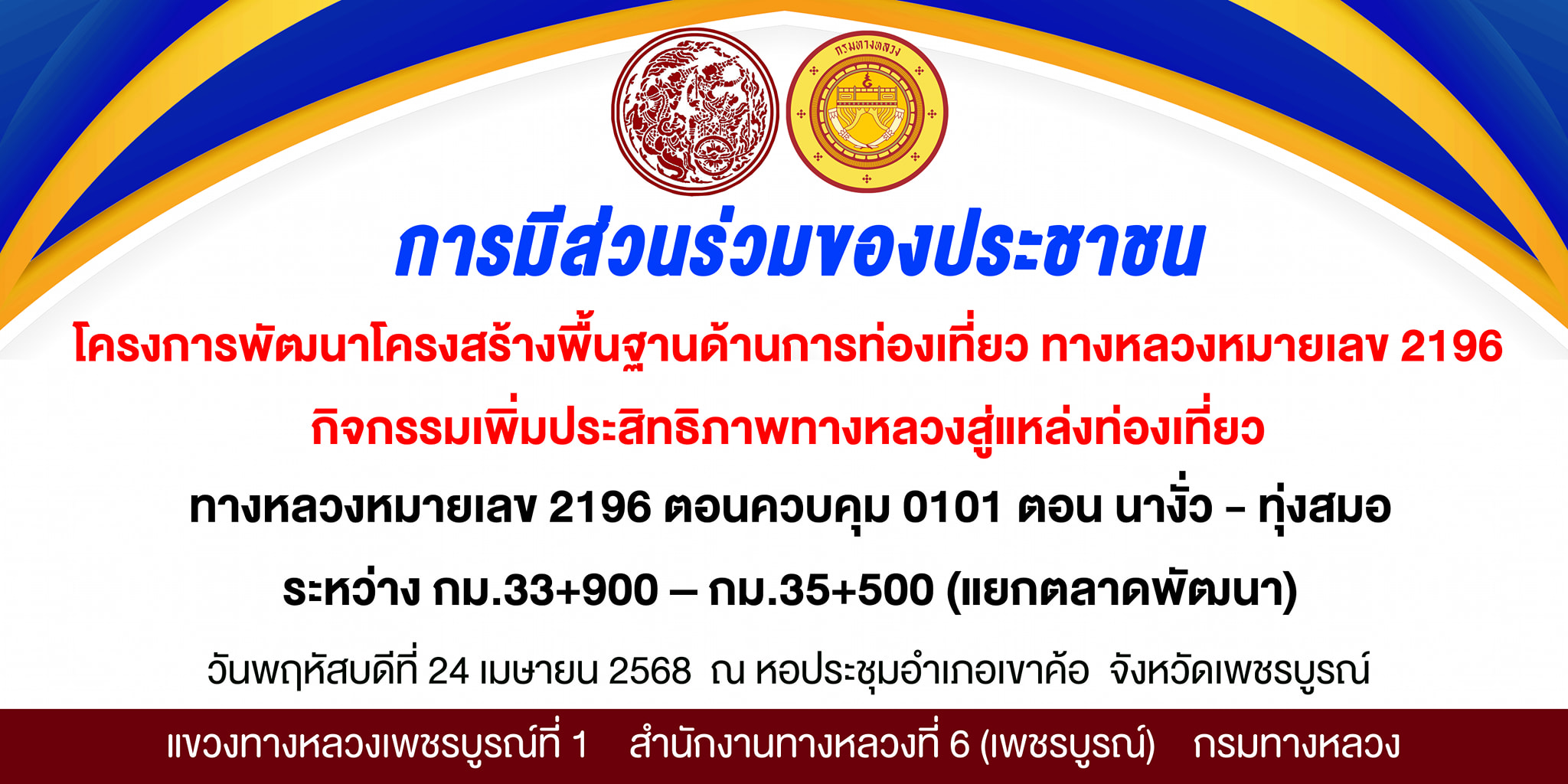 ขอเชิญเข้าร่วมการประชุมการมีส่วนร่วมของประชาชน โครงการพัฒนาโครงสร้างพื้นฐานด้านการท่องเที่ยว ทางหลวงหมายเลข 2196 กิจกรรมเพิ่มประสิทธิภาพทางหลวงสู่แหล่งท่องเที่ยว ทางหลวงหมายเลข 2196 ตอนควบคุม 0101 ตอน นางั่ว – ทุ่งสมอ ระหว่าง กม.33+900 – กม.35+500 (แยกตลาดพัฒนา) ตำบลเขาค้อ อำเภอเขาค้อ จังหวัดเพชรบูรณ์ เพื่อรับฟังข้อมูลโครงการ พร้อมร่วมแสดงความคิดเห็น อันจะเป็นประโยชน์ต่อโครงการ ในวันพฤหัสบดีที่ 24 เมษายน 2568 เวลา 09.00 – 11.30 น. ณ หอประชุมอำเภอเขาค้อ จังหวัดเพชรบูรณ์