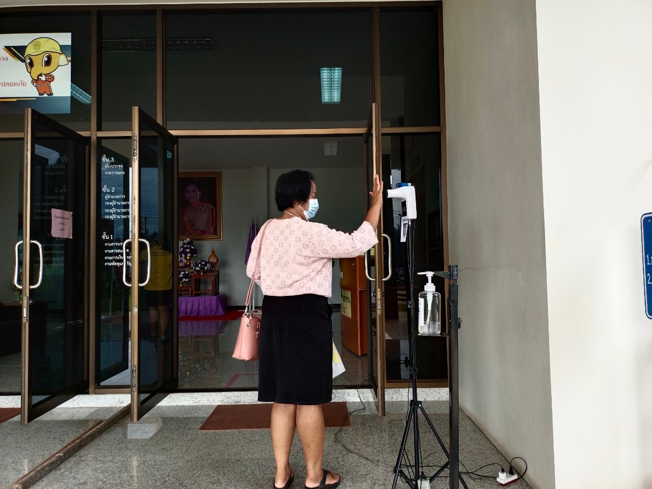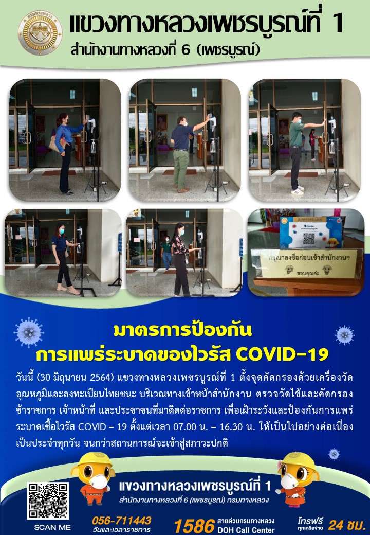 แขวงทางหลวงเพชรบูรณ์ที่ 1 จัดตั้งตู้พ่นน้ำยาฆ่าเชื้อ และจุดคัดกรองด้วยเครื่องวัดอุณหภูมิ วันที่ 30 มิถุนายน 2564 ตั้งแต่เวลา 07.00 น. – 16.30 น.