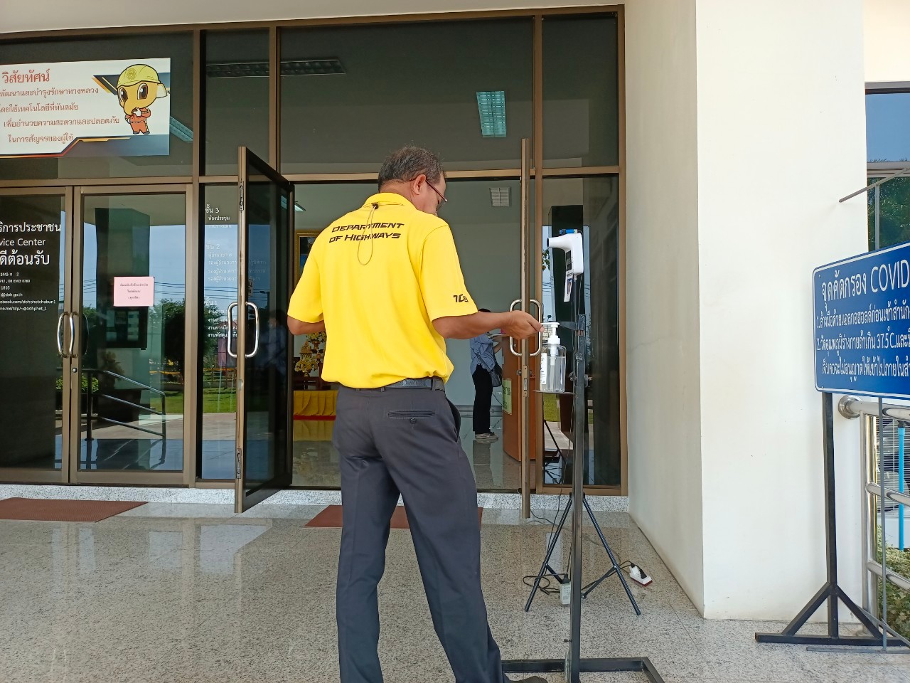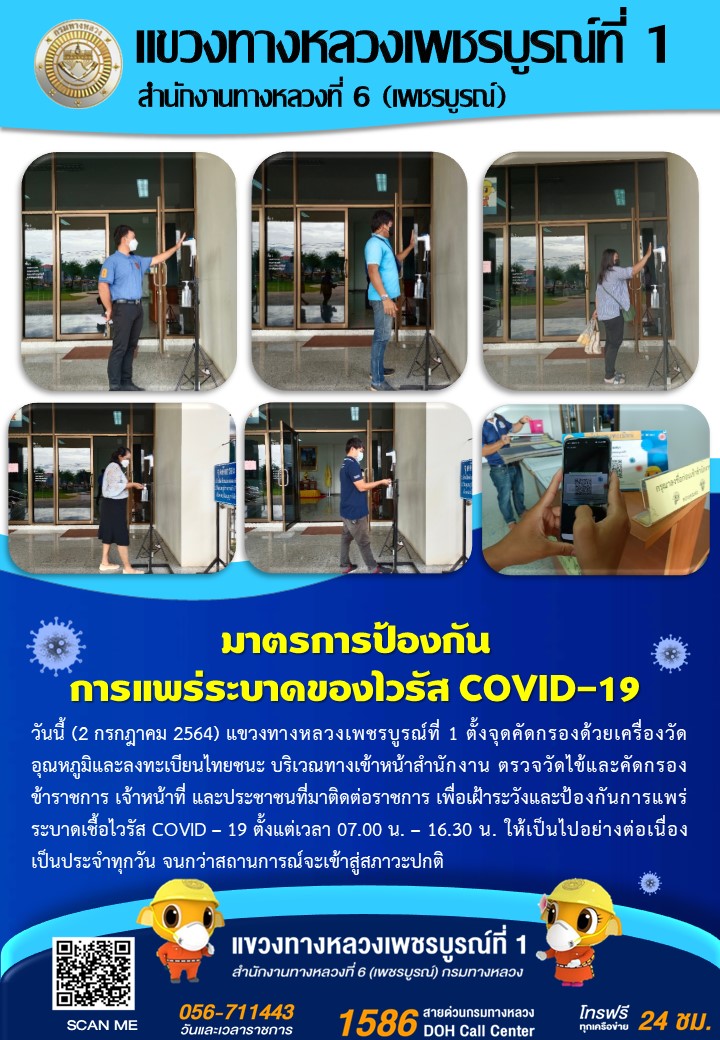 แขวงทางหลวงเพชรบูรณ์ที่ 1 จัดตั้งตู้พ่นน้ำยาฆ่าเชื้อ และจุดคัดกรองด้วยเครื่องวัดอุณหภูมิ วันที่ 2 กรกฎาคม 2564 ตั้งแต่เวลา 07.00 น. – 16.30 น.
