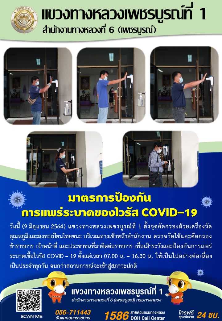 แขวงทางหลวงเพชรบูรณ์ที่ 1 จัดตั้งตู้พ่นน้ำยาฆ่าเชื้อ และจุดคัดกรองด้วยเครื่องวัดอุณหภูมิ วันที่ 9 มิถุนายน 2564 ตั้งแต่เวลา 07.00 น. – 16.30 น.