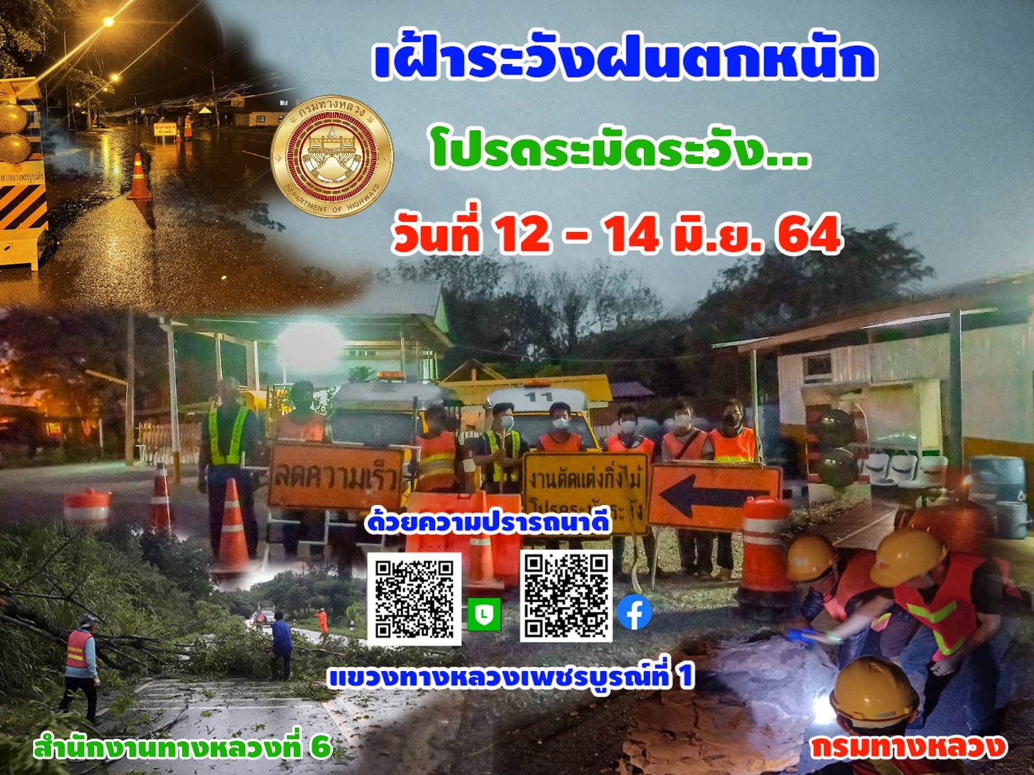 #เฝ้าระวังฝนตกหนัก #โปรดระมัดระวัง แขวงทางหลวงเพชรบูรณ์ที่ 1 ได้เตรียมความพร้อมของเจ้าหน้าที่และอุปกรณ์ความปลอดภัย เพื่ออำนวยความสะดวกและปลอดภัยแก่ผู้ใช้เส้นทาง ตลอด 24 ชม. โดยสามารถเข้าดำเนินการได้ทันทีหากเกิดเหตุการณ์