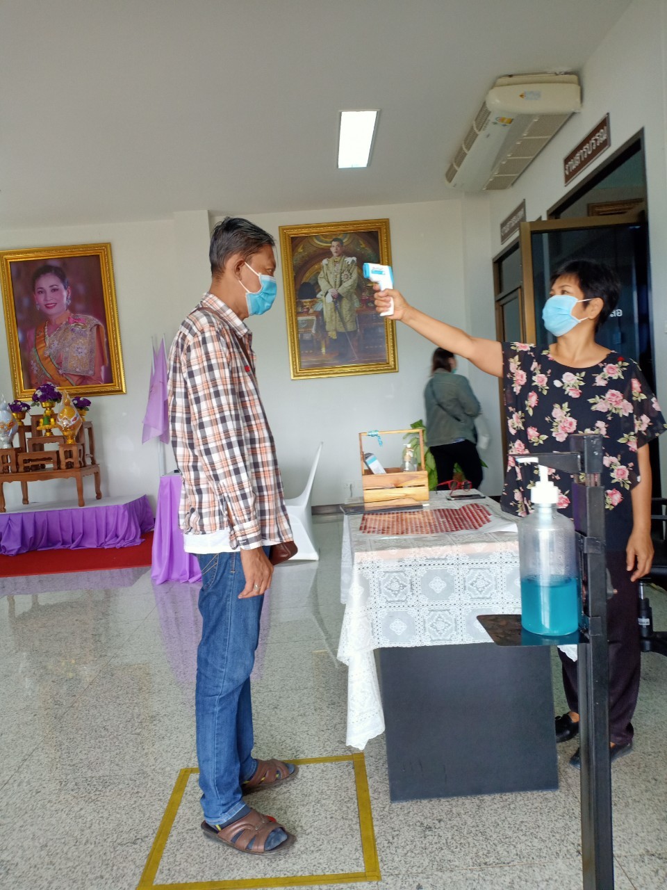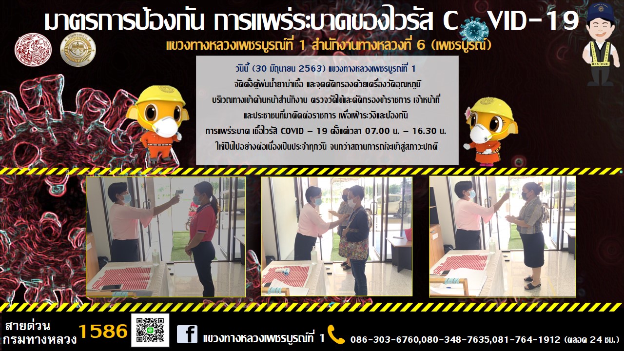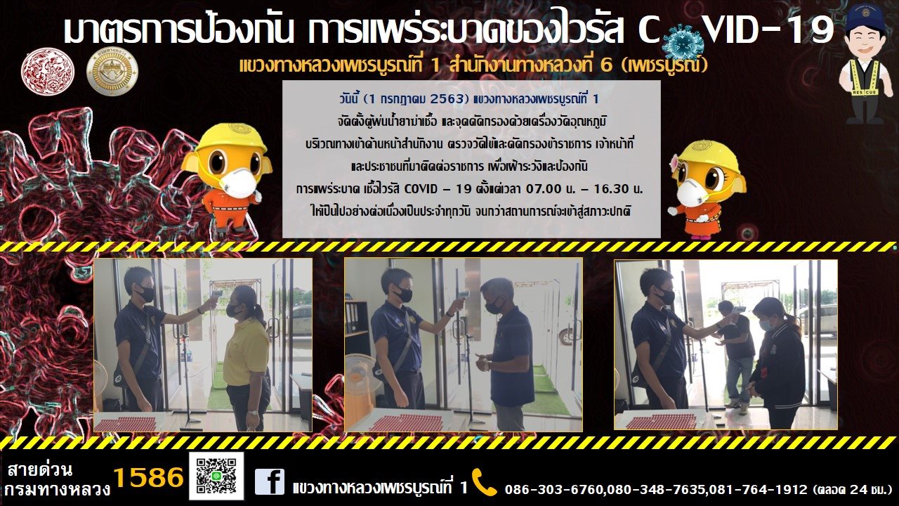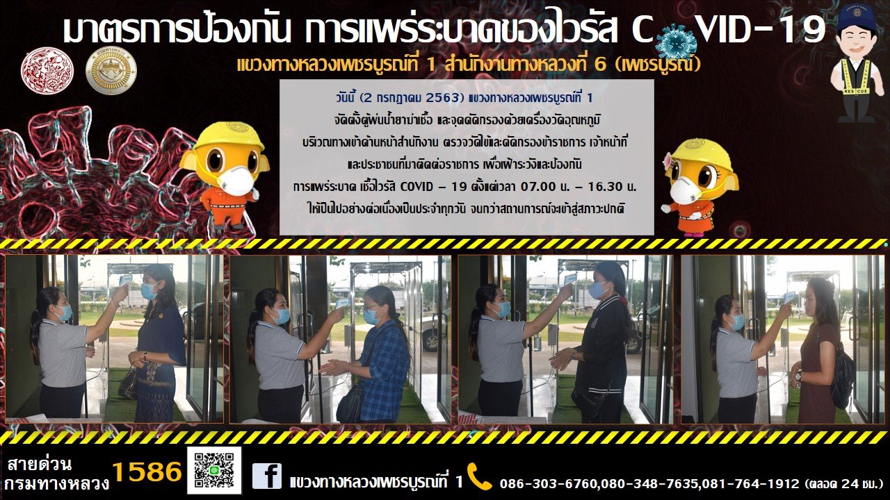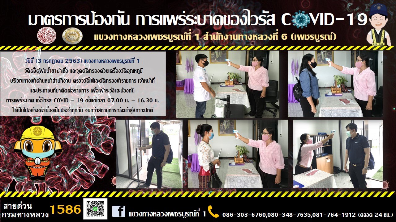 จัดตั้งตู้พ่นน้ำยาฆ่าเชื้อ และจุดคัดกรองด้วยเครื่องวัดอุณหภูมิ บริเวณทางเข้าด้านหน้าสำนักงาน |