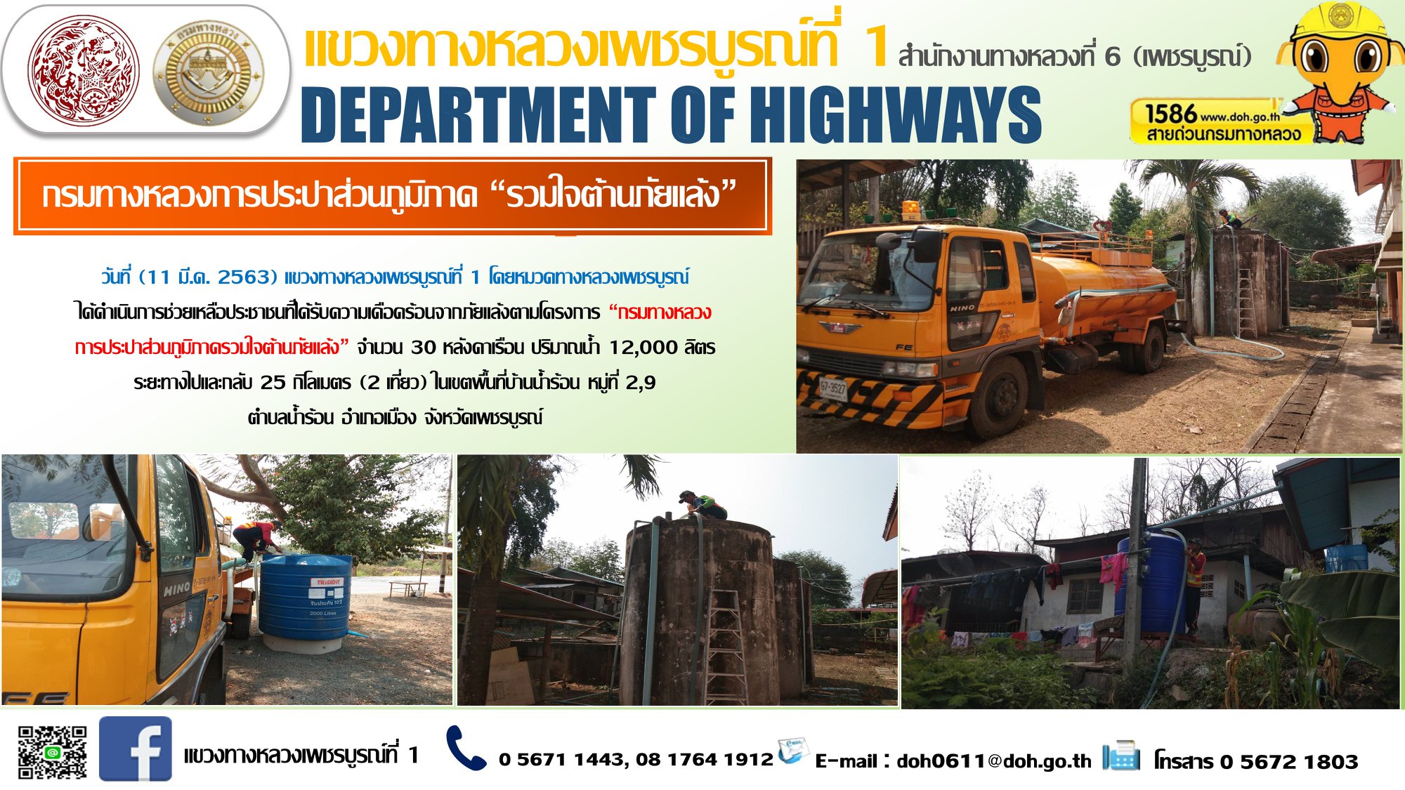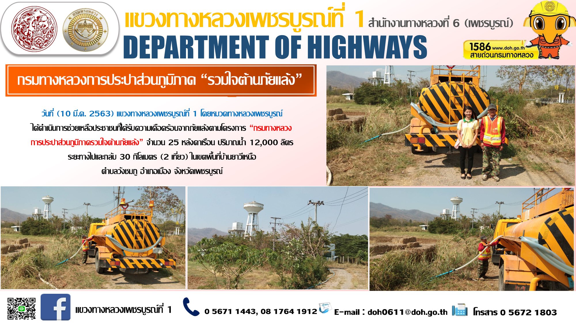 ดำเนินการช่วยเหลือประชาชนที่ได้รับความเดือดร้อนจากภัยแล้งตามโครงการ “กรมทางหลวง การประปาส่วนภูมิภาครวมใจต้านภัยแล้ง” ตั้งแต่วันที่ 6 ม.ค. 63 – 10 มีนาคม 63