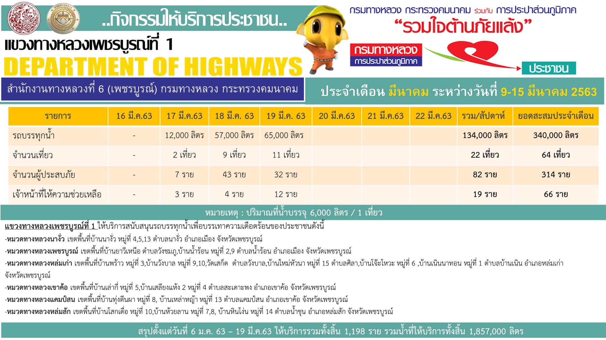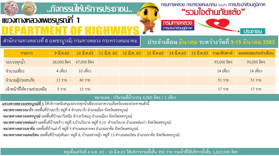 ดำเนินการช่วยเหลือประชาชนที่ได้รับความเดือดร้อนจากภัยแล้งตามโครงการ “กรมทางหลวง การประปาส่วนภูมิภาครวมใจต้านภัยแล้ง” ตั้งแต่วันที่ 6 ม.ค. 63 – 11 มีนาคม 63 ให้