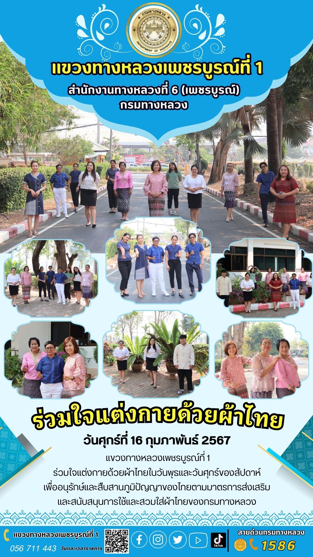 แขวงทางหลวงเพชรบูรณ์ที่ 1 ร่วมใจแต่งกายด้วยผ้าไทยในวันพุธและวันศุกร์ของสัปดาห์ เพื่ออนุรักษ์และสืบสานภูมิปัญญาของไทยตามมาตรการส่งเสริมและสนับสนุนการใช้และสวมใส่ผ้าไทยของกรมทางหลวง