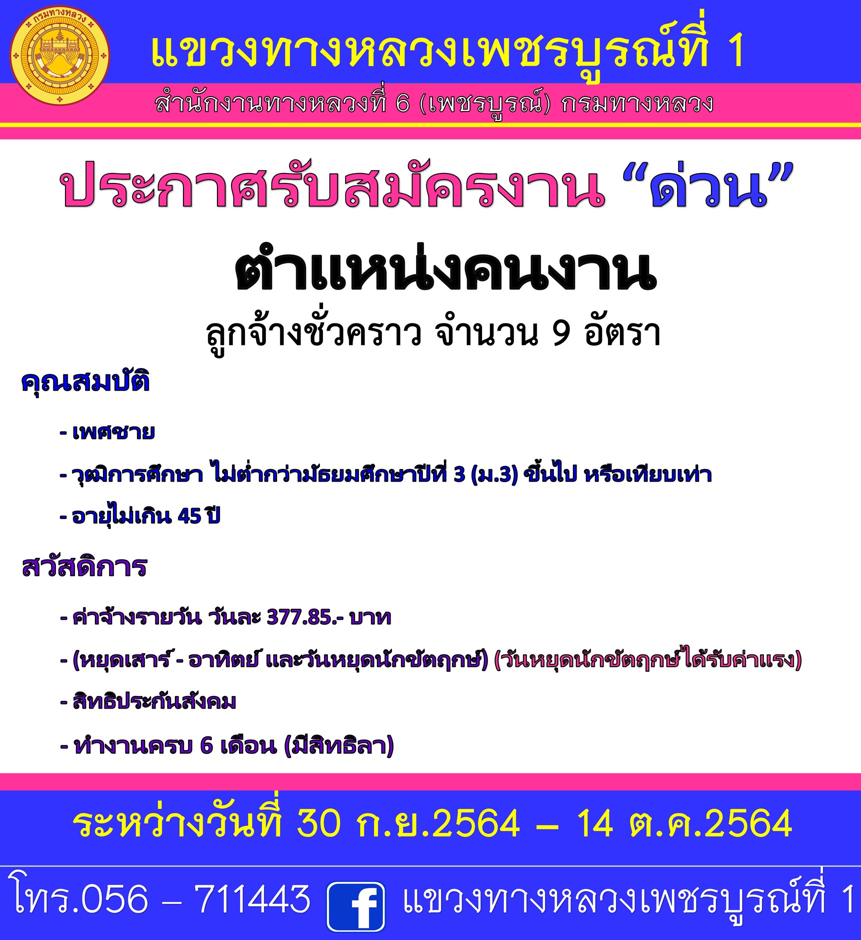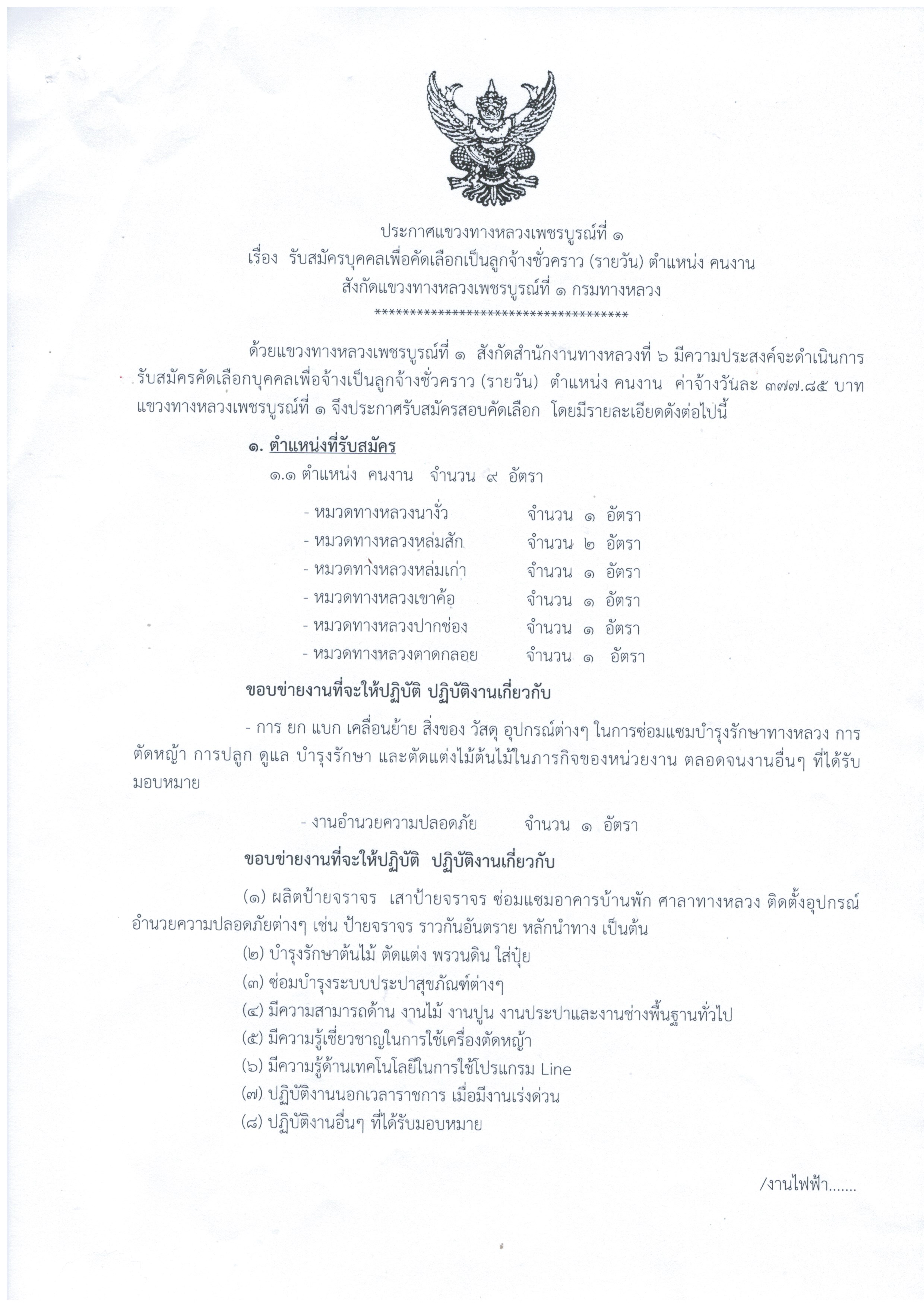 รับสมัครบุคคลเพื่อคัดเลือกเป็นลูกจ้างชั่วคราว (รายวัน) ตำเเหน่ง คนงาน สังกัดเเขวงทางหลวงเพชรบูรณ์ที่ 1 กรมทางหลวง