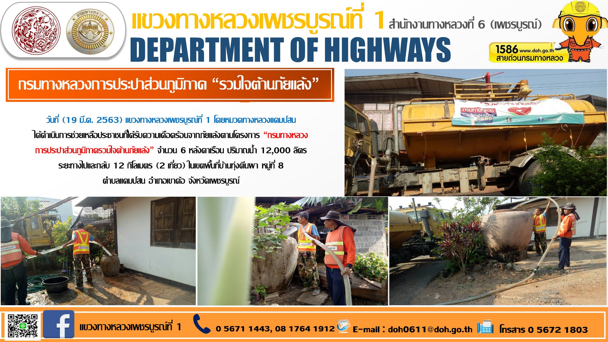 วันที่ (19 มี.ค. 2563) แขวงทางหลวงเพชรบูรณ์ที่ 1 โดยหมวดทางหลวงแคมป์สนได้ดำเนินการช่วยเหลือประชาชนที่ได้รับความเดือดร้อนจากภัยแล้งตามโครงการ “กรมทางหลวง การประปาส่วนภูมิภาครวมใจต้านภัยแล้ง” จำนวน 6 หลังคาเรือน ปริมาณน้ำ 12,000 ลิตร ระยะทางไปและกลับ 12 กิโลเมตร (2 เที่ยว) ในเขตพื้นที่บ้านทุ่งตีนผา หมู่ที่ 8 ตำบลแคมป์สน อำเภอเขาค้อ จังหวัดเพชรบูรณ์