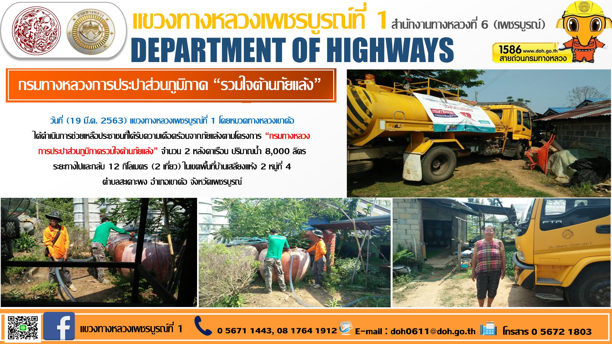 วันที่ (19 มี.ค. 2563) แขวงทางหลวงเพชรบูรณ์ที่ 1 โดยหมวดทางหลวงเขาค้อได้ดำเนินการช่วยเหลือประชาชนที่ได้รับความเดือดร้อนจากภัยแล้งตามโครงการ “กรมทางหลวง การประปาส่วนภูมิภาครวมใจต้านภัยแล้ง” จำนวน 2 หลังคาเรือน ปริมาณน้ำ 8,000 ลิตร ระยะทางไปและกลับ 12 กิโลเมตร (2 เที่ยว) ในเขตพื้นที่บ้านเสลียงแห้ง 2 หมู่ที่ 4 ตำบลสะเดาะพง อำเภอเขาค้อ จังหวัดเพชรบูรณ์