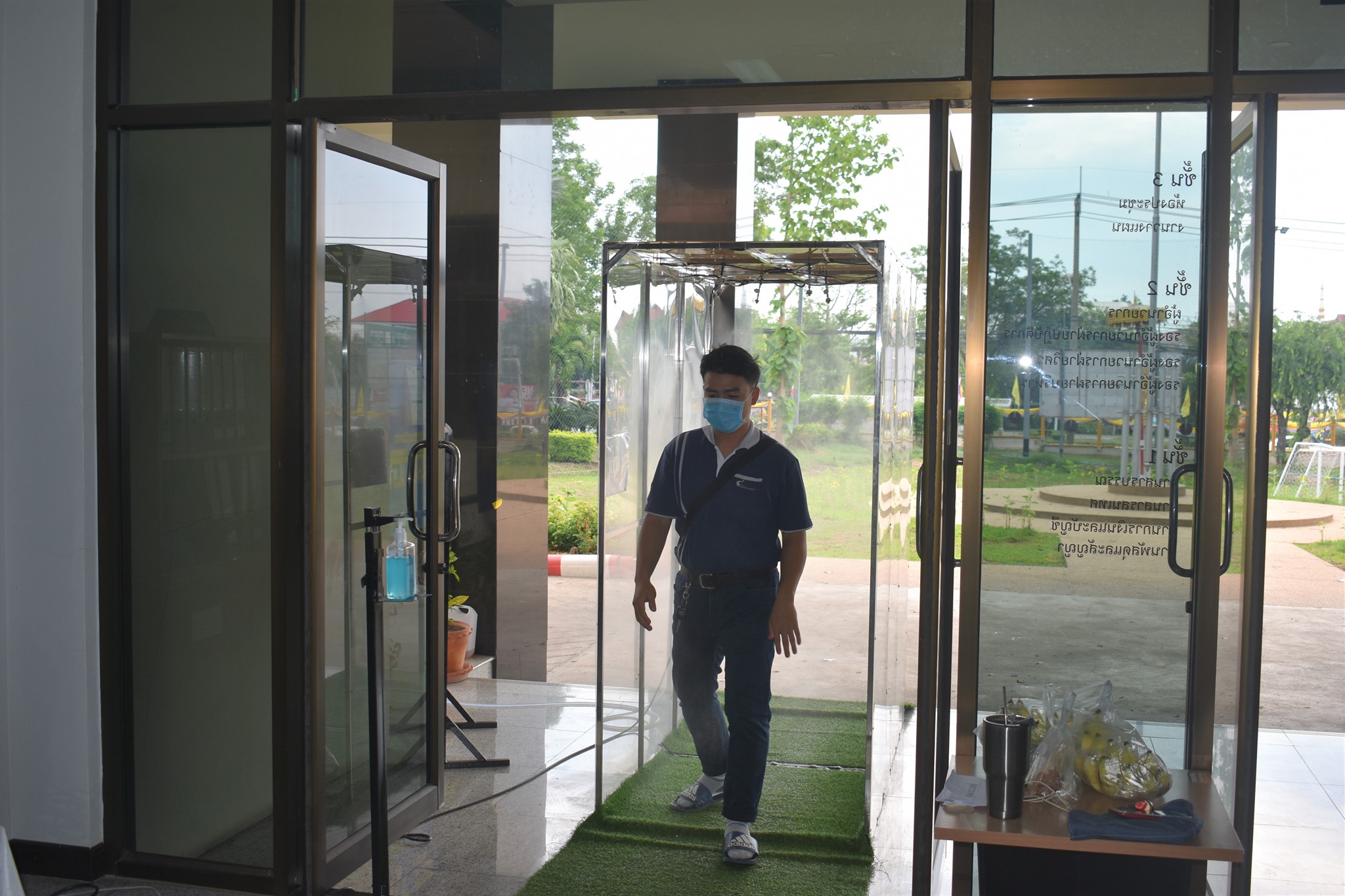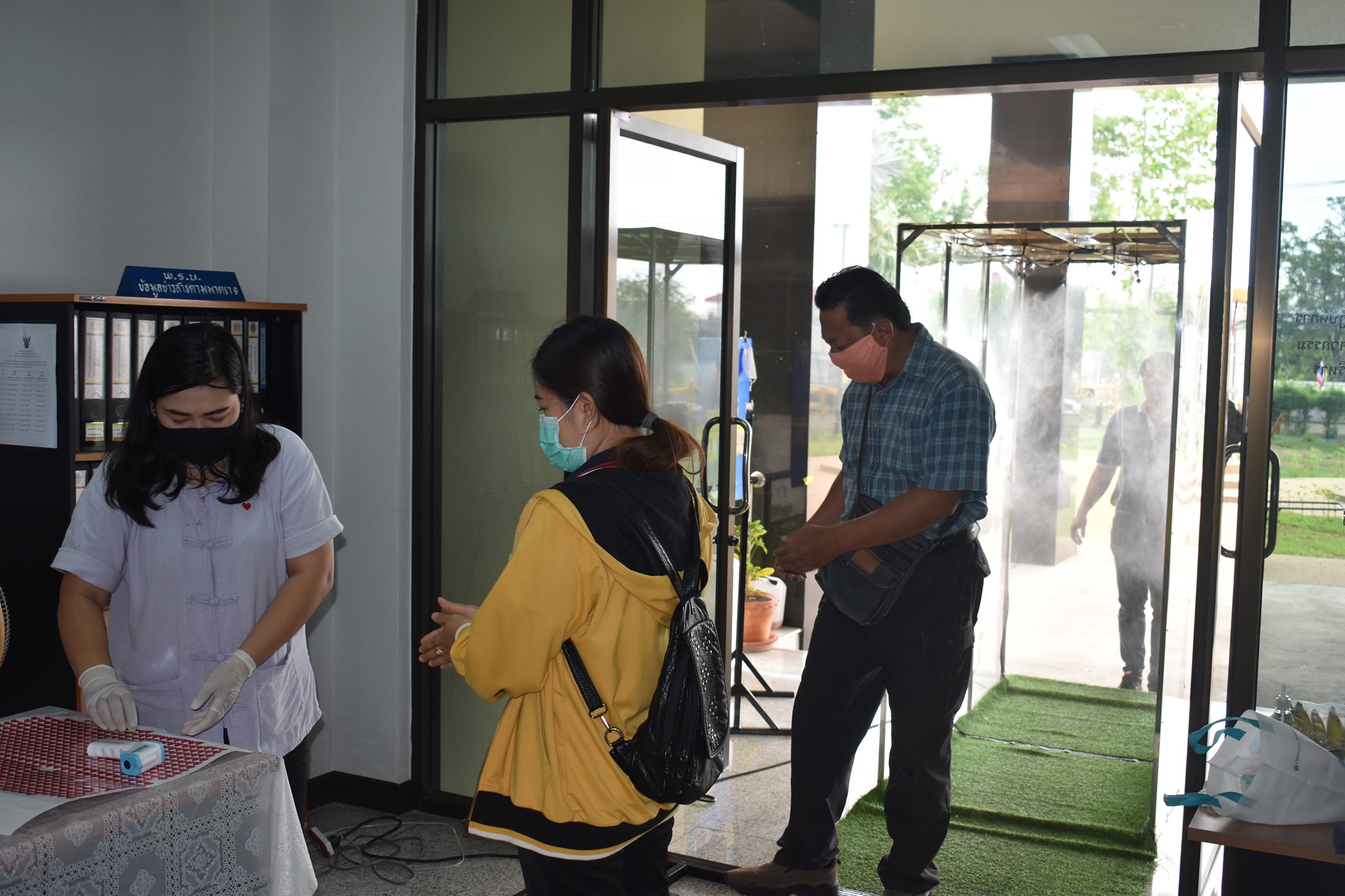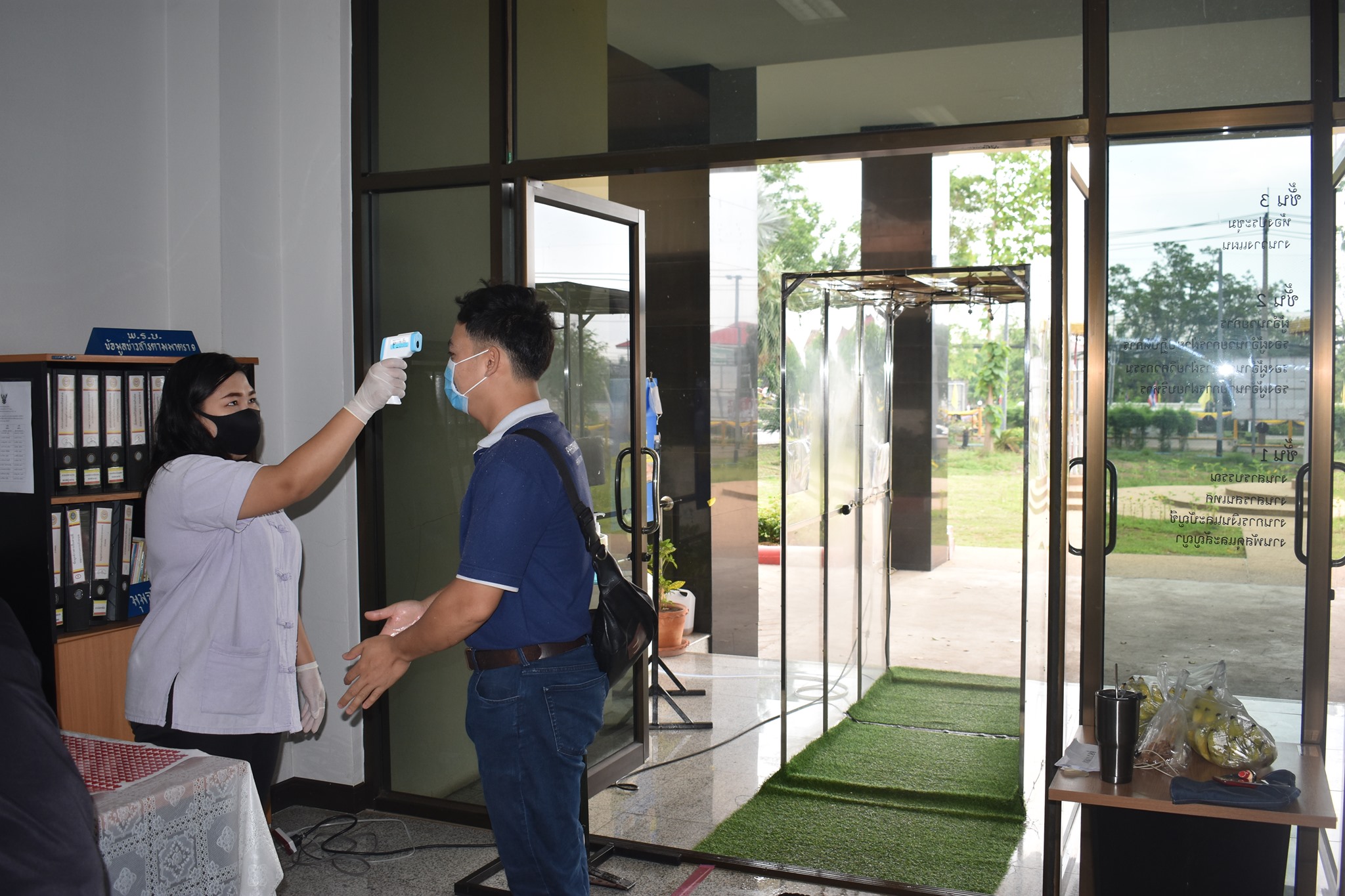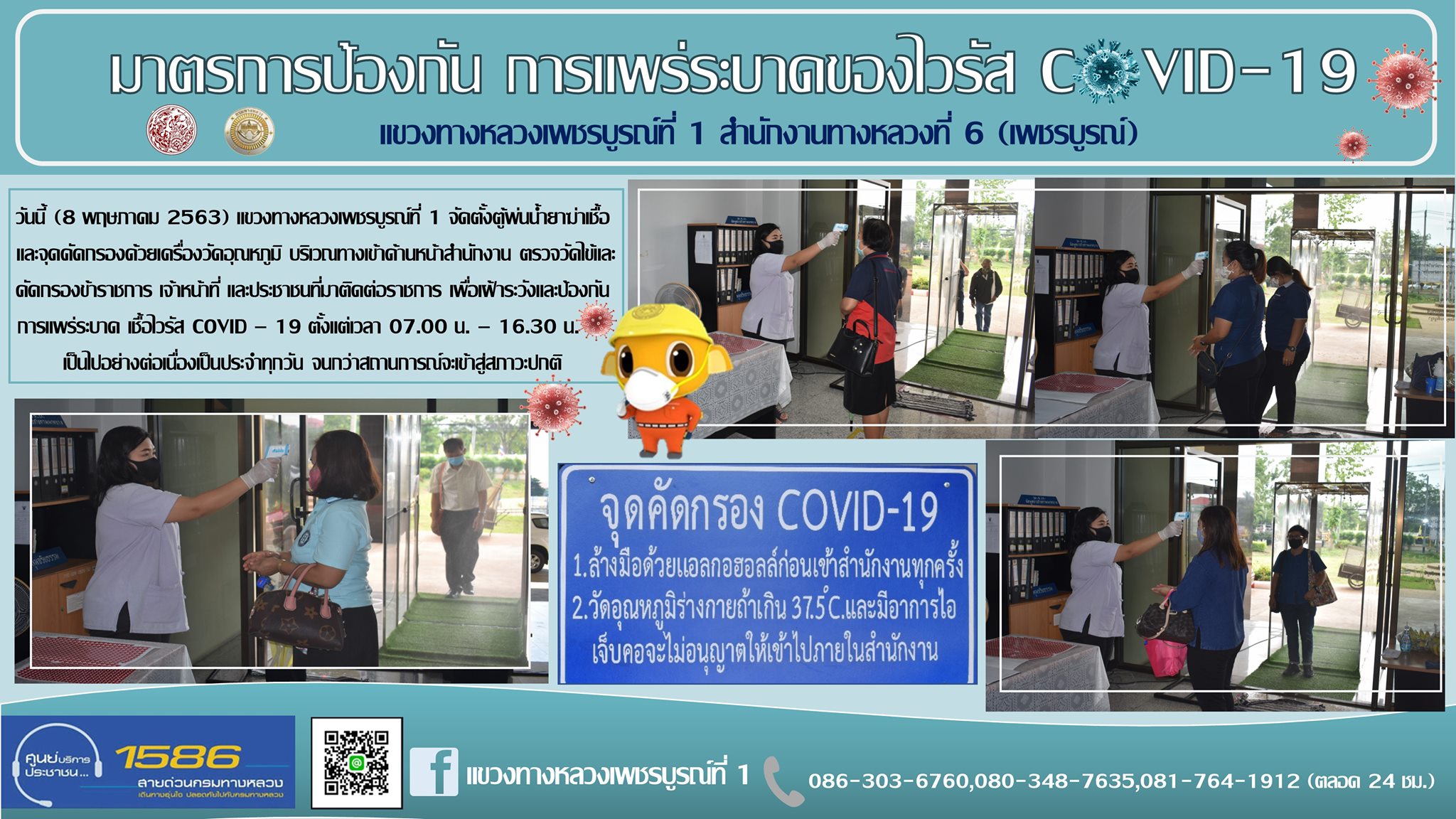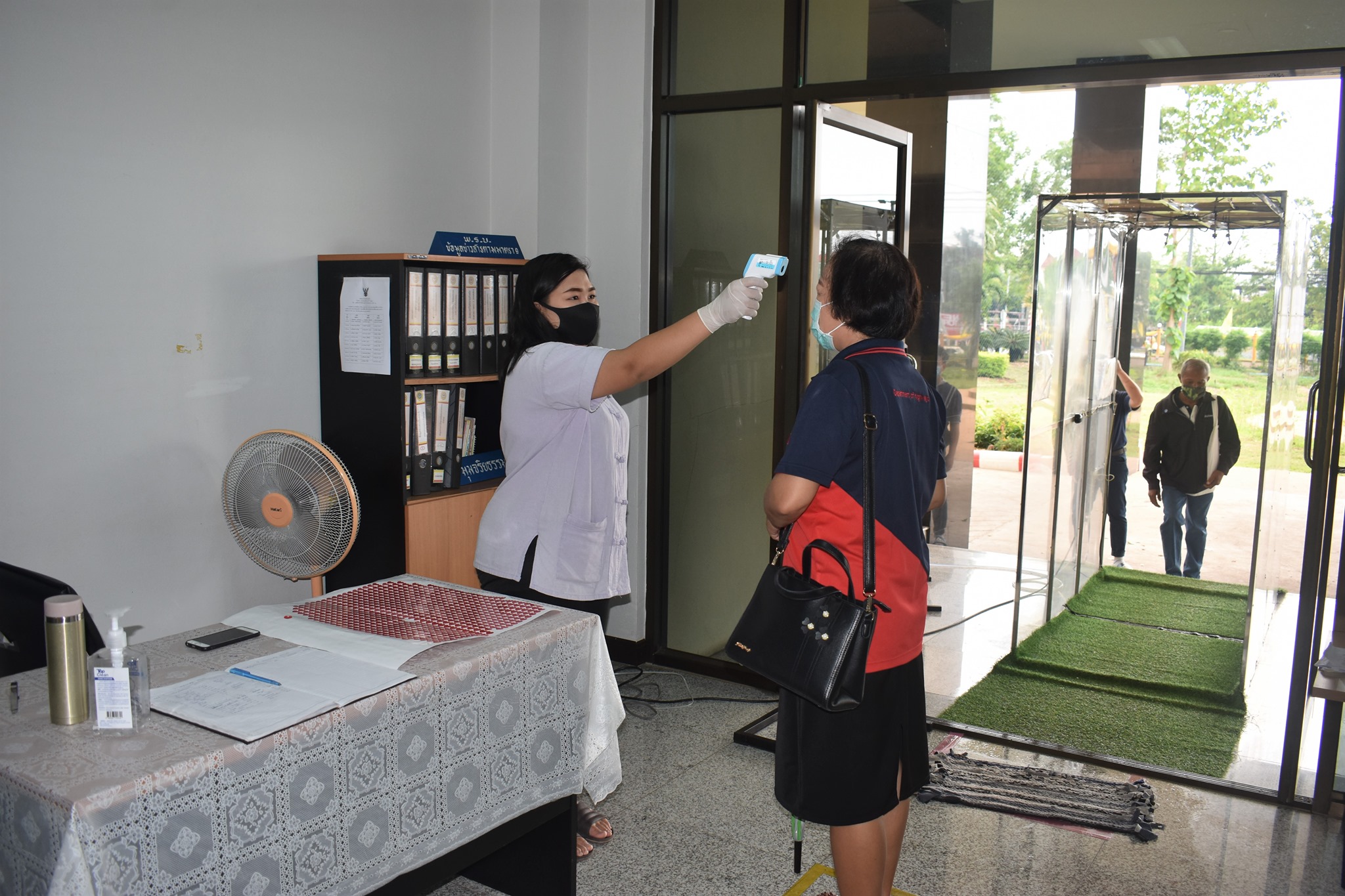 และจุดคัดกรองด้วยเครื่องวัดอุณหภูมิ บริเวณทางเข้าด้านหน้าสำนักงาน ตรวจวัดไข้และคัดกรองข้าราชการ เจ้าหน้าที่ และประชาชนที่มาติดต่อราชการ เพื่อเฝ้าระวังและป้องกัน การแพร่ระบาด เชื้อไวรัส COVID – 19 ตั้งแต่เวลา 07.00 น. – 16.30 น. ให้เป็นไปอย่างต่อเนื่องเป็นประจำทุกวัน จนกว่าสถานการณ์จะเข้าสู่สภาวะปกติ