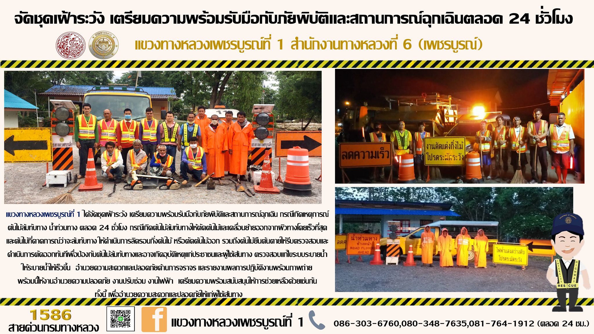 นายอลงกรณ์ พรหมศิลป์ ผู้อำนวยการแขวงทางหลวงเพชรบูรณ์ที่ 1 ได้สั่งการให้หมวดทางหลวงในพื้นที่ และหน่วยงานที่เกี่ยวข้อง เตรียมความพร้อมรับมือกับภัยพิบัติ และสถานการณ์ฉุกเฉิน ตลอด 24 ชั่วโมง เพื่ออำนวยความสะดวกและปลอดภัยให้แก่ผู้ใช้เส้นทาง ดังนี้