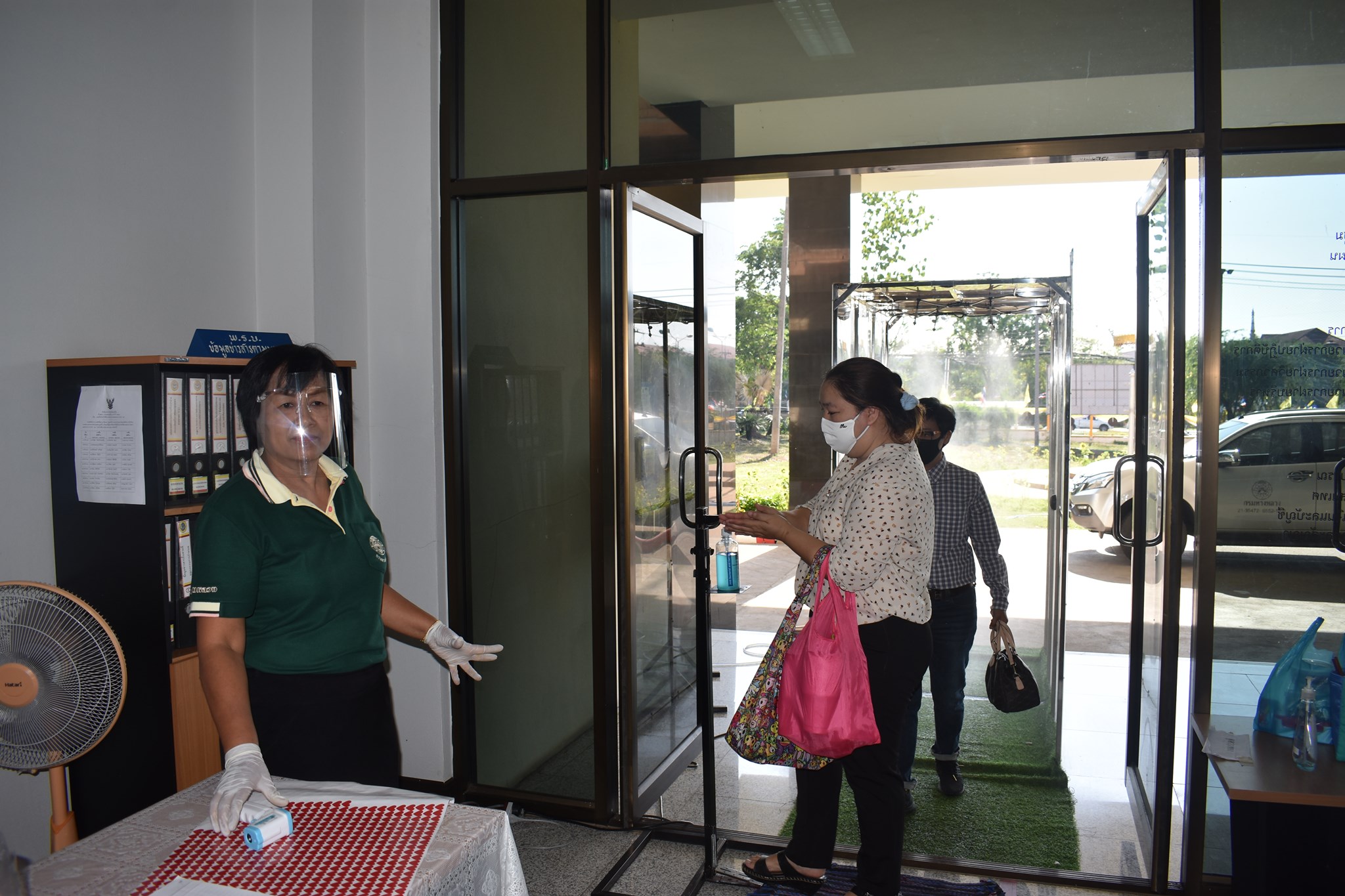 จัดตั้งตู้พ่นน้ำยาฆ่าเชื้อ และจุดคัดกรองด้วยเครื่องวัดอุณหภูมิ