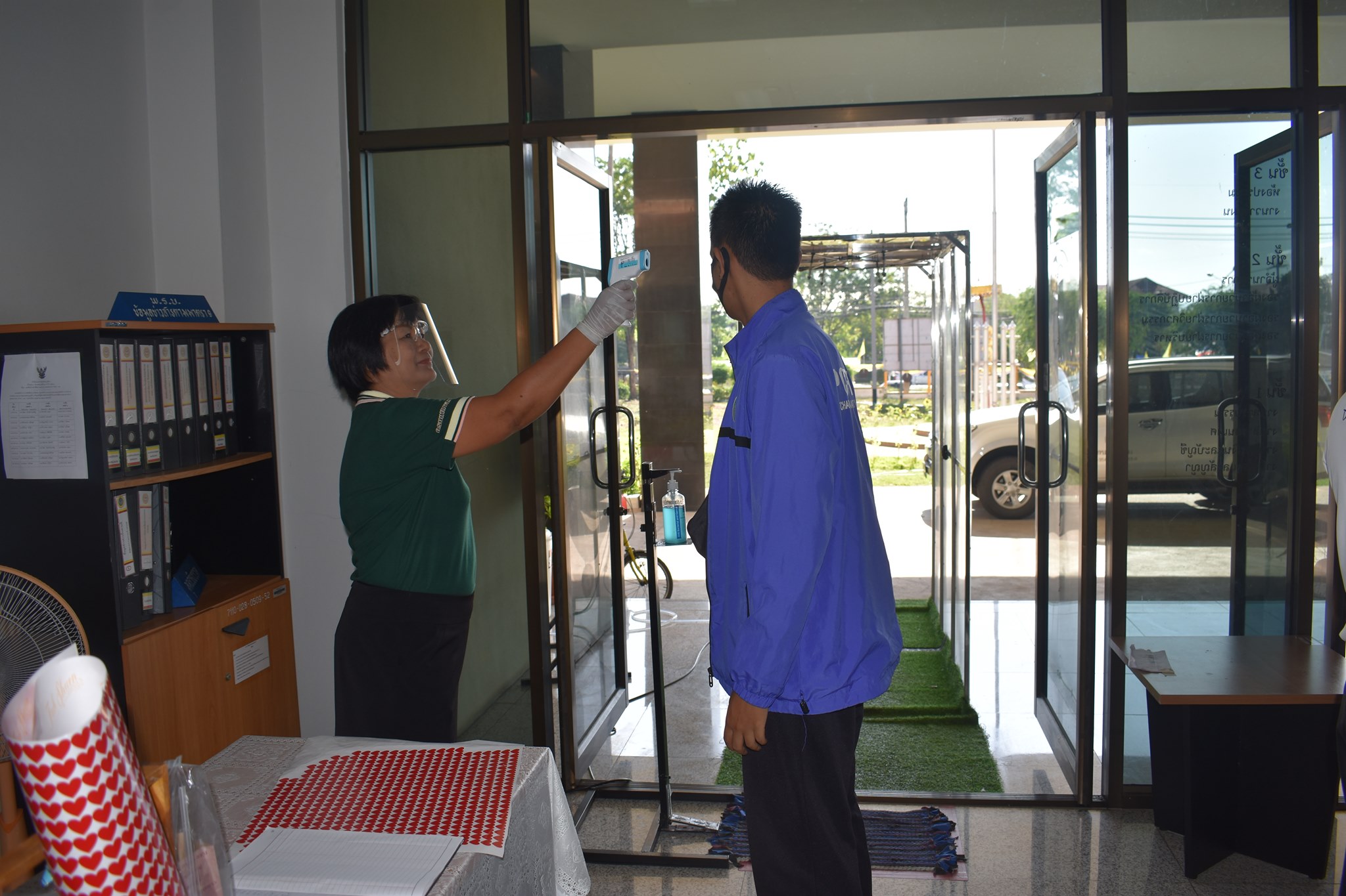 บริเวณทางเข้าด้านหน้าสำนักงาน ตรวจวัดไข้และคัดกรองข้าราชการ เจ้าหน้าที่และประชาชนที่มาติดต่อราชการ เพื่อเฝ้าระวังและป้องกัน