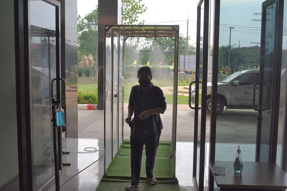 จัดตั้งตู้พ่นน้ำยาฆ่าเชื้อ และจุดคัดกรองด้วยเครื่องวัดอุณหภูมิ