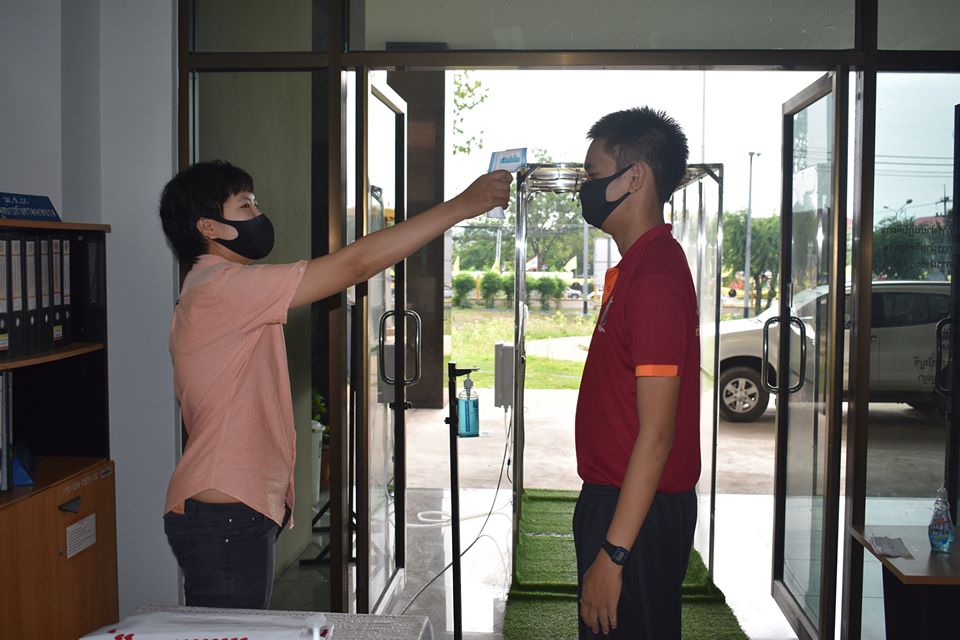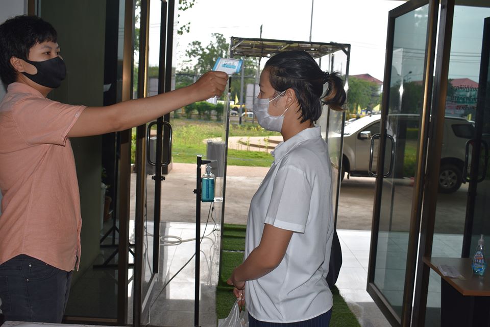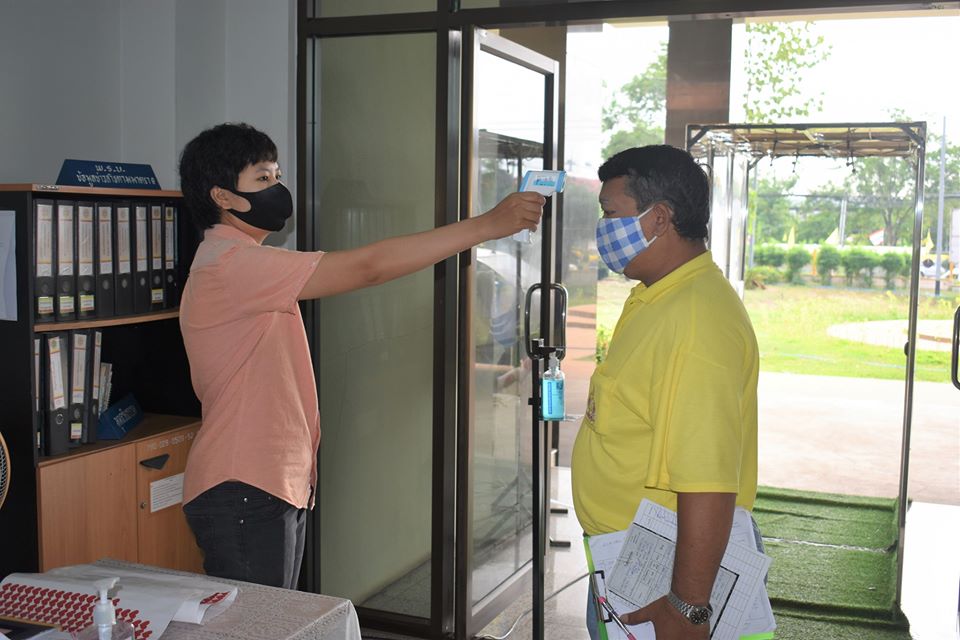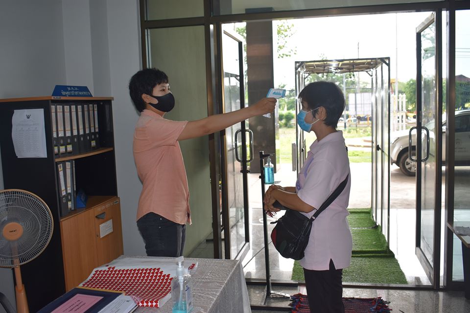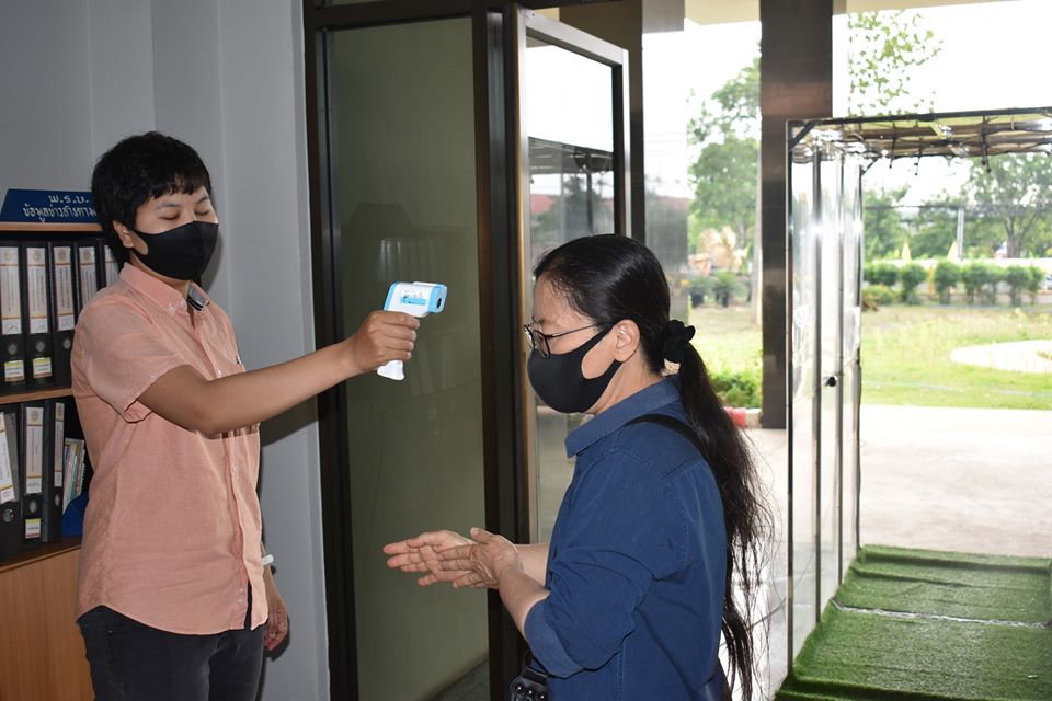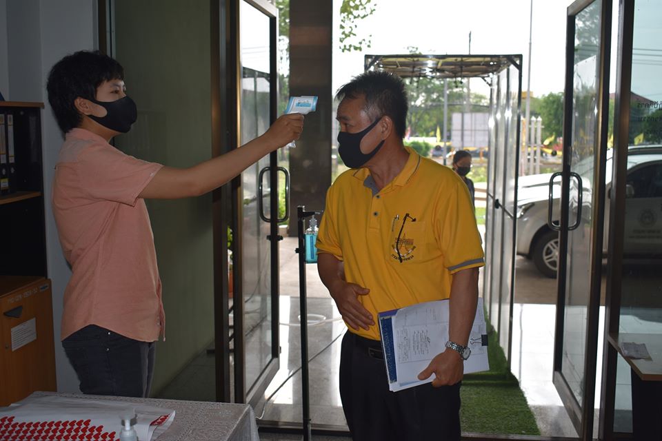 บริเวณทางเข้าด้านหน้าสำนักงาน ตรวจวัดไข้และคัดกรองข้าราชการ เจ้าหน้าที่และประชาชนที่มาติดต่อราชการ เพื่อเฝ้าระวังและป้องกัน