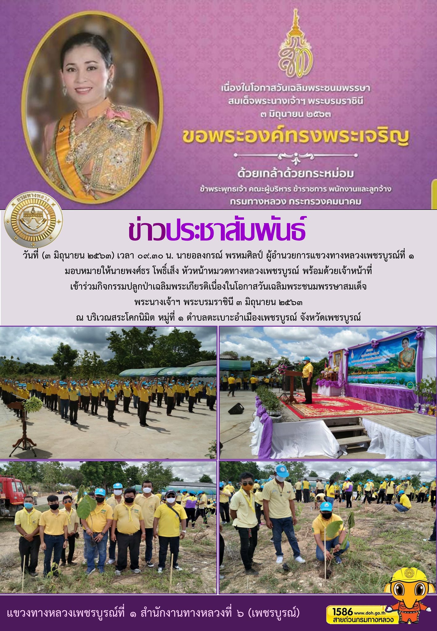 วันที่ (3 มิถุนายน 2563) เวลา 09.30 น. นายอลงกรณ์ พรหมศิลป์ ผู้อำนวยการแขวงทางหลวงเพชรบูรณ์ที่ 1 มอบหมายให้นายพงศ์ธร โพธิ์เส็ง หัวหน้าหมวดทางหลวงเพชรบูรณ์ พร้อมด้วยเจ้าหน้าที่ เข้าร่วมกิจกรรมปลูกป่าเฉลิมพระเกียรติเนื่องในโอกาสวันเฉลิมพระชนมพรรษาสมเด็จพระนางเจ้าฯพระบรมราชินี 3 มิถุนายน 2563 ณ บริเวณสระโคกนิมิต หมู่ที่ 1 ตำบลตะเบาะ อำเมืองเพชรบูรณ์ จังหวัดเพชรบูรณ์